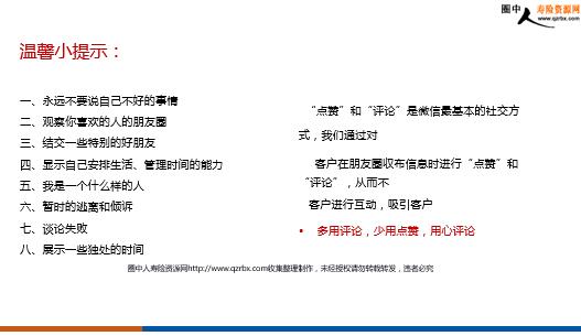微信营销操作技巧 互联网时 代新变化 微营销是一种趋势,未来“见人”的成本越来越高, 谁朋友圈、微信群经营的好,未来市场就掌握的好 如何才能做好微信营销? 第一步:树立个人形象 1:头像的设置 2:名字的设置 3:个性签名的设置 1:头像的设置 人与人接触的第一个三秒钟的时间是非常重要的 形象要走在能力前面 1、要阳光大气正能量,把你最好看,最美丽的头像设 置成你微信的头像! 2、不要频繁更改头像! 3、核心点:头像一定要有亮点 1、真人头像+方案 只需要站在你自己品牌的LOGO旁边,然后拍一张相片做头像,这样别人一眼就知道你是做什么的,这就叫“有图有真相”。如果没有公司品牌,没有LOGO墙,这种的话你需要拍一张正规的相片,在相片的旁边写上你的“定位语”。据心理学家研究发现,在虚拟的世界里聊天,如果对方能够看到真人的样子,那么,信任感会更强。 2、品牌型头像 如果你更希望别人记住你的品牌,而不是个人的话,你可以直接把你的品牌或者你做的事情加到微信头像里。 3、卡通头像类型 由于前两种头像类型太普遍了,你如果想鹤立鸡群的话,可以尝试用“卡通头像”,但这里的“卡通”不是只到网站上随便下载一张卡通头像,而是找专业插画师根据你真人照片一比一描绘的那种,然后在头像旁边写上“定位词”。 4、名人合影类型 如果你想让你的粉丝在加你的一瞬间就对你的价值信任度很高,名人合影类型的头像无疑是个非常有效的选择。名人指的不一定是明星,可以是某一个领域的专家或者是网红、歌手、作家等,只要是大众识别度高且传播正能量的名人,都有助于提升你的价值信任度或者行业权威度。