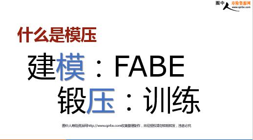 FABE模压训练 FABE建模解析 模压魅力 模压背景&定义 模压背景&定义 为什么会有模压训练我们需要什么样的营销训练模压的概念 尴尬 产品无形 难度最高 标准 培训需求 标准化地量产技术 建模:FABE 锻压:训练 什么是模压 形 魂 正确认识模压 FABE建模解析 生活中的应用什么是FABE FABE建模训练 什么是 FABE F:属性 Feature A:优势 Advantage B:利益 Benefit E:证据 Evidence 因为(F-属性)…… 所以(A-优势)…… 对您而言(B-利益)…… 您看(E-证据)…… F : 中药凉茶 E:中国凉茶每卖出10罐,其中7罐是王老吉 B:怕上火喝王老吉 A:180年中药秘方