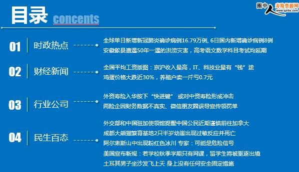 每日新闻速递 2020年7月8日 星期三 目录 时政热点 财经新闻 行业公司 民生百态 全球单日新增新冠肺炎确诊病例16.79万例, 6日国内新增确诊病例8例,均为境外输入病例 安徽歙县遭遇50年一遇的洪涝灾害,高考语文数学科目考试均延期,8日考试正常进行 全国平均工资版图:京沪收入最高,IT、科技业最有“钱”途 一降再降!鸡蛋价格大跌近30%,养殖户卖一斤亏0.7元 外资寿险入华按下“快进键” 或对中资寿险形成冲击 两险企因财务数据不真实、微信朋友圈误导宣传领罚单 外交部和中国驻加使领馆提醒中国公民近期谨慎前往加拿大 成都大熊猫繁育基地2只半岁幼崽出现过敏反应并死亡 阿尔卑斯山中出现粉红色冰川 专家:可能是危险信号 美国宣布新规:若学校秋季学期只有网课,留学生将被驱逐出境 土耳其男子坐沙发飞上天 身上没有任何安全固定措施 时政热点 全球单日新增新冠肺炎确诊病例16.79万例, 6日国内新增确诊病例8例,均为境外输入病例 2020-07-07 14:19 来源:钛媒体 据美国约翰斯·霍普金斯大学的疫情统计数据显示,7月6日全天,全球新增新冠肺炎确诊病例16.79万例,其中,美国新增新冠肺炎确诊病例4.5万例。 据国家卫健委,7月6日0—24时,31个省(自治区、直辖市)和新疆生产建设兵团报告新增确诊病例8例,均为境外输入病例(辽宁2例,上海2例,四川2例,内蒙古1例,广东1例);无新增死亡病例;新增疑似病例2例,均为境外输入病例(内蒙古1例,上海1例)。 安徽歙县遭遇50年一遇的洪涝灾害,高考语文数学科目考试均延期,8日考试正常进行 2020-07-07 13:28 来源:每日经济新闻 安徽省教育招生考试院通报称,7月7日凌晨,安徽省黄山市歙县遭遇50年一遇的洪涝灾害,县城多处洪水上路、严重积水、道路受阻。截至7月7日上午9:00,歙县考区歙县中学、歙县二中2个高考考点大部分考生均未进入考点,高考无法正常开始。 安徽省委、省政府高度重视,主要负责同志在歙县查看灾情和考点情况,调度指挥高考工作。经研究并报教育部,歙县考区原定7月7日语文、数学科目考试延期举行,7月8日综合、外语科目考试正常举行。具体安排将及时通知考生。