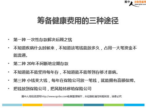 销售妙招 ●你有社保吗? ●单位为你买过商业保险吗? ●你目前最担心发生的事是什么?客户通常回答:疾病和意外一旦讲到疾病和意外,就会马上强调社保的不足。 健康险三问 社保与商保认知 社保内的药费可以报销,社保外的药费不能报销。社保不可能包所有的医药费;单位补充了商业保险,福利还真不错,但有的时候单位的报销什么谁也搞不清楚,而且自费药品不报销,因为单位买的都是基础部分,以一年为限,一旦退休了单位就不给买了。单位的福利只能解决当下的问题,自己的问题还要自己承担的。如果曾经被拒保过,再买保险需要如实告知。社保只解决基本问题,单位的保险补充的也是基础部分。 ●既然有社保也有单位的保险,为什么还担心?发生疾病并不可怕,可怕的是如果一旦我们遭遇不幸,那很多的医药费也许就要我们自己负担,那社保不一定能起到作用,因为有很多自费要是需要自己负担的。每个人生病是不能替代的,一旦发生疾病,只有自己帮自己,别人是没有用的,所以我们现在应该提前帮自己建立一个不可被挪用的独占的帐户。 理念沟通 理念强化--用车险做案例 娣:你有没有车?客户:有啊!娣:你的车要不要买保险?如果不买保险是不敢开车的?客户:对的! 娣:如果没有车险不敢开车,那我们人没有风险保障也不敢生病,人总会有一个风险存在。你买的车险有没有第三者责任保险?客户:有啊娣:买了多少?客户:好像是100万娣:那第三者责任保险是服务谁的?第三者责任险是赔别人的,第三者我们也不认识,我们愿意给不认识的人承担100万的风险,那你认为我们的家人没有他重要吗?是不是我们的家人要比他重要一倍、两倍、甚至是更多呢? 理念强化--用车险做案例 未来一定要“抢着”第一个生病家里一个人发生疾病,你不可能跟另一半说:我们的家庭资产是共同创造的,你只能用家庭的一半资金,还有一半要留给我,因为将来我老了也一定会生病的。事实上,当家里第一个人生病时,就会把家里所有的资金都投在里面,如果第二个人生病,将因为缺少医药费而被剥夺健康的权利,因为那个时候已经没有能力创造财富了。所以,一定要为家里的每一位成员提前建立一笔不可挪用的专享健康帐户。