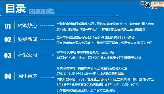 每日新闻速递 2020年7月15日 星期三 目录 时政热点 财经新闻 行业公司 民生百态 全球新病例单日新增超23万,国内新增确诊病例3例,均为境外输入病例 贵州独山县回应“烧掉400亿”:推进形象工程政绩工程问题整改 二季度进出口降幅收窄6.3个百分点 出口连续3个月正增长 国家粮库储存玉米变筛糠?中储粮已展开调查,曾因大火烧粮损失上亿 2030年代中期 中国将成世界最大保险市场 18家险企今年“补血”超580亿 资本补充债发行利率降至3.5% 外交部领事司:提醒中国公民近期谨慎前往澳大利亚 270万元!35小时!台州一商人加纳确诊包机回国 恢复开放不足一个月,香港迪士尼7月15日起重新关闭,再开园时间未定 7月1日至7日海南离岛免税购物累计6.5万人次,总额4.5亿元 小学生研究癌症获全国大奖?官方最新回应 时政热点 全球新病例单日新增超23万,国内新增确诊病例3例,均为境外输入病例 2020-07-14 09:17 来源:中国经济网 世界卫生组织的数据显示,12日全球的单日新增确诊病例再次创下新高,超过23万例。截至北京时间14日凌晨,全球确诊病例超过1297万例,累计死亡病例超过57万例。 7月13日0—24时,31个省(自治区、直辖市)和新疆生产建设兵团报告新增确诊病例3例,均为境外输入病例(在上海);无新增死亡病例;无新增疑似病例。 贵州独山县回应“烧掉400亿”:推进形象工程政绩工程问题整改 2020-07-14 13:32 来源:成都商报社 7月12日晚,微博账户名为@观视频工作室发布名为《亲眼看看独山县怎么烧掉400亿!周年特辑(上)》的视频。视频中主持人质疑,独山县位于贵州黔南州,只有一个街道和8个乡镇,借了400亿的债打造的景观,部分却已成为烂尾景区。针对上述情况,对于视频中主持人称“独山县负债400亿,造价2亿的天下第一水司楼等景观已成为烂尾楼”的说法,前述独山县委宣传部的工作人员称,“这个情况是不实的”。 独山县融媒体中心消息称,目前,续建项目已完工18个,在建项目32个,转建项目17个。对社会关注的“水司楼”(净心谷大酒店)项目,通过努力,采取市场化运作模式签订合作协议,将于近期进场施工。同时,全县严格落实《政府投资条例》,严格执行《独山县政府投资项目管理办法》相关规定,严格项目审批,坚决杜绝新增形象工程、政绩工程。