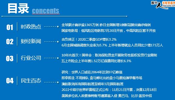 每日新闻速递 2020年7月17日 星期五 目录 时政热点 财经新闻 行业公司 民生百态 全球累计确诊逾1365万例 昨日全国新增1例新冠肺炎确诊病例 为境外输入病例 国家电影局:低风险区电影院7月20日开放,中高风险区暂不开放 由负转正!2020二季度GDP增长3.2% 6月全国城镇调查失业率为5.7% 上半年新增就业人员同比少增173万人 10年内首次!国常会:取消保险资金开展财务性股权投资行业限制 五上市险企上半年揽1.52万亿保费同比增长6.3% 研究:世界人口或在2064年达到97亿峰值 即拿即走 不用排队 盒马孵化出的盒小马要抢滩早餐市场 澳航取消所有国际航班至明年3月|国际航班 2022卡塔尔世界杯赛程正式公布:11月21日开赛,决赛12月18日 美国多位名人政要推特账号遭黑客入侵 奥巴马、比尔·盖茨中招 时政热点 全球累计确诊逾1365万例 昨日全国新增1例新冠肺炎确诊病例 为境外输入病例 2020-07-16 12:00 来源:环球网 Worldometer网站实时统计数据显示,截至北京时间7月16日6时30分左右,全球累计确诊新冠肺炎病例13657875例,累计死亡病例585535例,74个国家确诊病例超过万例。 7月15日0—24时,31个省(自治区、直辖市)和新疆生产建设兵团报告新增确诊病例1例,为境外输入病例(在上海);无新增死亡病例;无新增疑似病例。 国家电影局:低风险区电影院7月20日开放,中高风险区暂不开放 2020-07-16 14:34:28 来源:AI财经社 7月16日消息,国家电影局今日在官网发布《关于在疫情防控常态化条件下有序推进电影院恢复开放的通知》。 通知称,低风险地区在电影院各项防控措施有效落实到位的前提下,可于7月20日有序恢复开放营业。中高风险地区暂不开放营业。一旦从低风险地区调整为中高风险地区,要严格执行疫情防控规定,从严从紧落实防控措施,电影院及时按要求暂停营业。