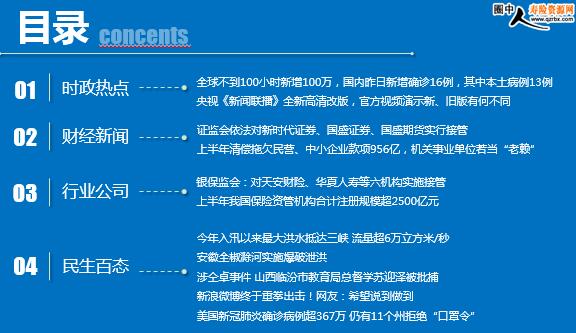 每日新闻速递 2020年7月20日 星期一 目录 时政热点 财经新闻 行业公司 民生百态 全球不到100小时新增100万,国内昨日新增确诊16例,其中本土病例13例(均在新疆) 央视《新闻联播》全新高清改版,官方视频演示新、旧版有何不同 证监会依法对新时代证券、国盛证券、国盛期货实行接管 上半年清偿拖欠民营、中小企业款项956亿,机关事业单位若当“老赖”,公务消费、办公用房等将受限 银保监会:对天安财险、华夏人寿等六机构实施接管 上半年我国保险资管机构合计注册规模超2500亿元 今年入汛以来最大洪水抵达三峡 流量超6万立方米/秒 安徽全椒滁河实施爆破泄洪 涉仝卓事件 山西临汾市教育局总督学苏迎泽被批捕 新浪微博终于重拳出击!网友:希望说到做到 美国新冠肺炎确诊病例超367万 仍有11个州拒绝“口罩令” 时政热点 全球不到100小时新增100万,国内昨日新增确诊16例,其中本土病例13例(均在新疆) 2020-07-19 11:42 来源:澎湃新闻 7月19日报道,17日全球新冠肺炎确诊病例总数超过了1400万,首次在不到100个小时内就激增了100万例。路透社称,自今年1月初开始报告有确诊病例以来,全球新冠肺炎确诊病例在3个月内增至了100万例,而如今却在短短4天内就从1300万例增至了1400万例。 7月18日0—24时,31个省(自治区、直辖市)和新疆生产建设兵团报告新增确诊病例16例,其中境外输入病例3例(广东2例,山东1例),本土病例13例(均在新疆);无新增死亡病例;新增疑似病例1例,为境外输入病例(在上海)。 央视《新闻联播》全新高清改版,官方视频演示新、旧版有何不同 2020-07-19 14:34:28 来源:IT之家 7 月 18 日晚间,央视 “新闻联播”、“天气预报”、“焦点访谈”全新改版,其中央视 “新闻联播”更换了新的片头,16:9 比例播出。而此前旧版的新闻联播片头已经使用了18年。 据了解,CCTV-13 新闻频道高清信号上星传输 7 月 19 日 0 点开始,卫星传输参数与 CCTV-11、CCTV-15 高清传输流相同。