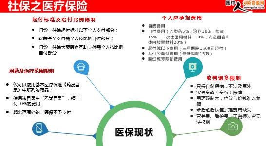 医疗保险的销售逻辑 PART 01 社保之医疗保险 医疗保险 养老保险 工伤保险 我国社会保障体系 失业保险 生育保险 社保之医疗保险 基本医疗保险 是为补偿劳动者因疾病风险造成的经济损失而建立的一项社会保险制度。通过用人单位和个人缴费,建立医疗保险基金,参保人员患病就诊发生医疗费用后,由医疗保险经办机构给予一定的经济补偿,以避免或减轻劳动者因患病、治疗等所带来的经济风险 城镇居民 基本医疗 保险 农村合作医疗 保险 城镇职工 1、连续足额缴纳基本医疗保险费的,次月享受; 2、中断后再次参保的,补足中断期间所欠基本医疗保险费,在连续 足额缴纳基本医疗保险费满六个月后,方可重新享受医保待遇。 社保之医疗保险 城乡居民 1、参保或续保时间为每年9月1日至12月25日,从次年1月1日起享受年度城乡居 民医保待遇。未在规定时间内办理参保或续保手续的,只能于下一年度办理。 2、出生三个月内参保缴费的新生儿享受城乡居民医保待遇时限为从出生起至当年 度12月31日止;出生三个月后参保缴费的,从缴费次月起至当年度12月31日止。 相通点 普通门诊待遇门诊特殊病种住院医疗大额医疗 城镇职工享有住院补充医疗待遇 城镇职工与城乡居民的领取待遇 社保之医疗保险