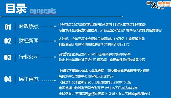 每日新闻速递 2020年7月22日 星期三 目录 时政热点 财经新闻 行业公司 民生百态 全球新增229780例新冠肺炎确诊病例 31省区市新增11例确诊,其中本土8例在新疆 乌鲁木齐全民免费核酸检测,所有营业宾馆为外地来乌人员提供免费食宿检测等 人社部:今年三项社会保险总减费将达1.9万亿 力度规模空前 蚂蚁集团计划在科创板和港交所寻求同步发行上市 保险资管业协会发布2020年信用评级机构评价结果 险企上半年累计被罚近1亿 短视频、直播卖保险成违规重灾区 中科院下属单位90多人集体离职,最新消息来了:副总理刘鹤要求展开深入调研 乌鲁木齐公交地铁及市际客运班线停运 《自然》杂志最新研究:北极熊或将于2100年灭绝 全国首趟中欧班列玩具专列开行 计划15天后抵达布拉格 全球仍有20万海员因疫情被困海上 外媒:有人不堪折磨跳海自杀 时政热点 全球新增229780例新冠肺炎确诊病例 31省区市新增11例确诊,其中本土8例在新疆 2020-07-21 11:42 来源:央广网 当地时间7月20日,世卫组织发布最新一期新冠肺炎每日疫情报告,全球新增229780例新冠肺炎确诊病例,新增死亡5111例。 7月20日0—24时,31个省(自治区、直辖市)和新疆生产建设兵团报告新增确诊病例11例,其中境外输入病例3例(上海2例,四川1例),本土病例8例(新疆7例,兵团1例);无新增死亡病例;无新增疑似病例。 乌鲁木齐全民免费核酸检测,所有营业宾馆为外地来乌人员提供免费食宿检测等 2020-07-21 14:34:28 来源:每日经济新闻 据央视新闻,乌鲁木齐市防疫指挥部20日晚间发布消息,为有效降低疫情扩散风险,乌鲁木齐市按照“应检尽检、愿检尽检”的原则,在全市范围内开展免费核酸检测,目前检测工作正在紧张有序快速推进。 检测不收取任何费用,凡是擅自收费的行为,不但要如数退还,还要依规依纪严肃处理。