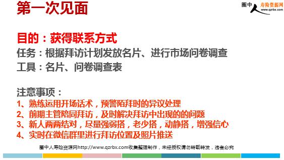 步步为营六步成交 拜访顾虑 问题7 不知道如何把准客户变成客户或增员? 问题1 不知道去哪? 问题2 不知道找谁? 问题3 不知道如何开口? 问题4 不知道如何异议处理? 问题5 不知道如何积累有效准客户? 问题6 不知道如何后期有借口经营准客户? 新人陌生拜访的顾虑 业务员和客户零压力 步步为营 六步成交 快速将陌生转化缘故 明知山有虎 偏向虎山行 六次见面拜访的好处 客户 营销员 团队 容易取得对公司的信任容易取得对业务员的信任客户零压力 容易拜访,有拜访目标方法零压力销售有利于业务增员和转介绍 活动量高转正率高举绩率高团队充满正能量 拜访前准备 目的:明确拜访任务任务:提前一周制定拜访计划工具:拜访计划表注意事项: 1、周一到周五陌生拜访,周六日缘故拜访 2、按照入司时间确定拜访目标及数量 3、每天必须2小时拜访 4、以月为周期,前两周陌拜,后两周回访 5、平台:一周一次养客,一月2次会销1、使用时间 每天二早时间 2、使用对象 团队小组伙伴 3、操作过程 小组每位伙伴共同研讨一周的拜访时间、地点、拜访成员、拜访工具的使用及客户资料收集数量 4、追踪情况 每天按照小组拜访计划表实行拜访计划 5、注意事项 在拜访中小组成员可以临时机动调整,保证每天2小时拜访。