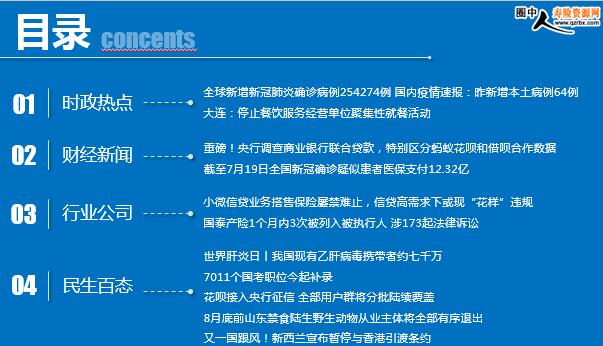 每日新闻速递 2020年7月29日 星期三 目录 时政热点 财经新闻 行业公司 民生百态 全球新增新冠肺炎确诊病例254274例 国内疫情速报:昨新增本土病例64例 大连:停止餐饮服务经营单位聚集性就餐活动 重磅!央行调查商业银行联合贷款,特别区分蚂蚁花呗和借呗合作数据 截至7月19日全国新冠确诊疑似患者医保支付12.32亿 小微信贷业务搭售保险屡禁难止,信贷高需求下或现“花样”违规 国泰产险1个月内3次被列入被执行人 涉173起法律诉讼 世界肝炎日丨我国现有乙肝病毒携带者约七千万 7011个国考职位今起补录 花呗接入央行征信 全部用户群将分批陆续覆盖 8月底前山东禁食陆生野生动物从业主体将全部有序退出 又一国跟风!新西兰宣布暂停与香港引渡条约 时政热点 全球新增新冠肺炎确诊病例254274例 国内疫情速报:昨新增本土病例64例 2020年07月28日 10:09 来源:央视 当地时间7月27日,世卫组织发布最新一期新冠肺炎每日疫情报告,全球新冠肺炎新增254274例,死亡新增5490例。疫情最为严重的美洲区域确诊病例达到8610134例(新增150089例),死亡337439例(新增3715例)。 国家卫健委28日通报,7月27日0—24时,31个省(自治区、直辖市)和新疆生产建设兵团报告新增确诊病例68例,其中境外输入病例4例(上海2例,北京1例,云南1例),本土病例64例(新疆57例,辽宁6例,北京1例);无新增死亡病例;无新增疑似病例。 大连:停止餐饮服务经营单位聚集性就餐活动 2020-07-28 13:17 来源:北京日报 大连市统筹推进新冠肺炎疫情防控和经济社会发展工作指挥部办公室发出通知: 根据大连市统筹推进新冠肺炎疫情防控和经济社会发展工作指挥部会议精神 ,结合我市当前疫情防控工作实际 ,决定自7月27日起停止餐饮服务经营单位聚集性就餐活动。
