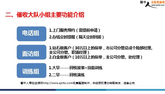 保险催收大会之催收逻辑及流程 专治各种不“付” 一、催收大队架构 1.数据组:内勤督导 2.电话组:助理+主管 3.面访组:职场经理、主管、内勤督导 4.训练组:功能组、内勤督导 二、催收大队小组主要功能介绍 电话组 面访组 训练组 1.大早------回收故事+技能训练 2.二早------回收演练 1.上门服务预约(需提前申请) 2.存钱定时提醒(隔天定时回拨) 1.钻石级客户(30万以上的保单,市公司分管总或个险部经理、支公司分管、职场经理) 2.白金级客户(10万以上的保单,支公司分管、处经理) 三、催收形式 1.单兵催收——礼品上门 2.组团催收——两人一组,相互陪访 3.VIP催收——专家团领导团陪同 4.集中催收——20万以上 活动搞起来 催收逻辑 四、催收逻辑---保单回收三要素 1、黄金24小时:回收要迅速,要在黄金24小时之内搞定。越是拖拖拉拉,变数也就越大。 2、上门面谈是关键:保单回收,一定要想尽办法登门拜访!一方面客户会觉得你真诚,另外一方面也便于一些突发情况的处理。因此,创造上门的机会非常重要。 3、异议处理:保单回收中客户肯定会有各种各样的问题,用心准备,专业服务,这些问题都会迎刃而解。 恭贺客户 1、恭贺客户 2、上门面谈 3、提示转账 4、异议处理 5、时间促成 四、催收逻辑---催收流程 恭贺客户 张哥,恭喜您抢到了xx“xx”预约份额!这几天全国都抢疯了,我省现在已经录的x个亿,全国录了x个亿,最大单是在我们xx,年缴x个亿,都说“抢到就是赚到”,可见咱们选择xx是多么明智啊!今天现场签单的客户90%以上已经完成转账的缴费工作,就差您了,公司领导非常重视,让我了解一