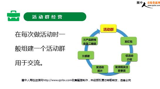 微信活动营销学习 微信的五大优势 以微信为载体的营销模式的五大优势 客户开拓 关系提升 需求挖掘 价值转化 辅导陪访 微信的五大优势 微信圈咨询传播更快捷,更广泛,可以在短时间大量获取客户。 客户开拓 更 简 单 借助大量资讯、活动等,可实现客户在微信上的高频互动。 关系提升 更 轻 松 微信是了解客户的窗口,有助于精准挖掘客户需求。 需求挖掘 更 精 准 在线进行产品推荐及购买,更便捷,能满足客户多方面需求。 价值转化 更 便 捷 在线微经营,一对多辅导,在线微产会,一对多陪访。 辅导陪访 更 高 效 微信是展示个人品牌的窗口,代表一个人的形象,是传递一个精神内涵的极佳渠道。 玩好微信营销也能让你收入惊喜! 微信 微信群经营 客户群经营 建立自己的客户群设置群规随时发照片发荣誉发惊喜 ……