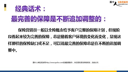 保险销售之抓住关键问题精准销售二 精准销售事半功倍 客户有需求,我们才有单。 客户不同的需求,需要不同的保险产品,而业务员应该用对应产品的销售策略及话术。 抓住问题关键 作为一名寿险营销人员,销售成败的关键在于抓住这些问题,发现需求。 “为什么我要买” “什么时候该买” “要买哪些保险” “要买多少保险” “跟谁买保险” 客户共同的疑问! 客户疑问解答: “要买哪些保险,要买多少保险” 最适合的保险是量身规划. 经典话术 深思问题:你想为家人留下什么? 经典话术:“假如因为公事出差,如一天往返,我不会留钱给小孩,因为晚上就回家了。如果是出差3天,就会放3000元在桌上,如果是您呢,会留钱么?如果是出差一个月呢?如果是一辈子,出去之后就不再回家,您会留多少钱给小孩?” 经典话术:一场大病需要多少钱? 人体有206块骨头,8大系统,36个重要器官,23万亿个细胞,除了头发不会病变以外,其余都有病变的可能性。人结束生命的方式只有两种:一种方式叫做意外,第二种方式是疾病。据科学统计,人一生罹患重大疾病的概率高达72.18%。如果真的得了重大疾病,那么有3笔钱是必须要面对的:第一笔钱是医疗费,第二笔钱是康复费,第三笔钱是收入损失费。医疗费,我相信您的医保可以解决一部分,但是康复费和收入损失费呢? “要买哪些保险,要买多少保险” 经典话术: 最完善的保障是不断追加调整的: 保险营销员一般以全险概念给予客户完整的保障计划,但现阶段看起来较为完善的保障,总是随着客户环境的变化而变化,显现这样那样的保险缺口或不足,可以说最完善的保障总是在不断的追加调整中。