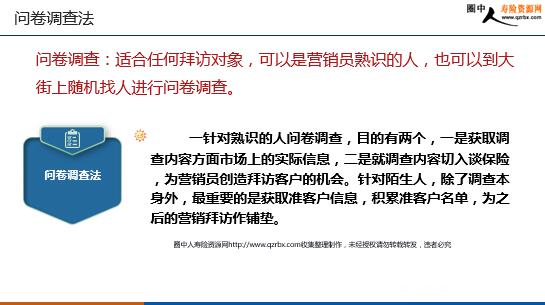 找好理由轻松拜访 保险销售 我们销的是什么? 答案:自己 我们售的是什么? 答案:观念 而要销自己售管理,首先得多拜访 拜访 面对拜访: 找不到拜访的理由!被客户拒绝!被客户放鸽子!匆忙应付! …… 拜访理由至关重要! 如何破解拜访理由这一难题 拜访理由是什么? 客户反应如何? 恰当的拜访理由能使客户 解除戒备 被尊重 容易接受 为下一步接触尊定基础 基本的拜访理由方法 机缘巧合法 问卷调查法 活动聚会法 业务服务法 礼品赠送法 机缘巧合法 机缘巧合法适用于有一定熟识程度的对象,主要是缘故市场和已成交保单的客户,主要目的是不给客户推销的感觉和购买的压力,而是如同“随风潜入夜、润物细无声”般进行销售。在机缘巧合下见面,在顺其自然中谈保险,最终也顺理成章地成交保单。让一切都在自然而然中发生,客户完全感觉不到你在特意推销保险,这是高明的营销员运用机缘巧合法的境界。这里主要总结了“顺道路过、接送子女上学”等2个方面的内容,供大家参考。 机缘巧合法 营销员先去到客户工作的地方或居住的小区,然后打电话告诉客户:“好久没见,今天我在您家附近办理一个理赔(或者其他什么事情),顺便来看看您。”见面之后,再以自己所办理之事为切入,和客户谈保险事宜。比如“××客户患胃癌去世了,我过来为他办理理赔。如今罹患重大疾病的人特别多,现在帮您检查一下健康保障,看够不够,有没有缺口,也帮您的家人检查一下。”如有缺口,就趁热打铁,帮客户补足保障。有实例在,客户不会拒绝,也不会认为你是为了利益而找他销售保险,而是真正关心他。