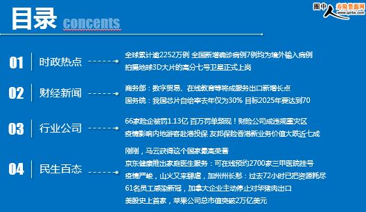 每日新闻速递 2020年8月21日 星期五 目录 时政热点 财经新闻 行业公司 民生百态 全球累计逾2252万例 全国新增确诊病例7例均为境外输入病例 拍摄地球3D大片的高分七号卫星正式上岗 2020年服务贸易前景如何?商务部:数字贸易、在线教育等将成服务出口新增长点 国务院:我国芯片自给率去年仅为30% 目标2025年要达到70 66家险企被罚1.13亿 百万罚单频现!财险公司成违规重灾区 疫情影响内地游客赴港投保 友邦保险香港新业务价值大跌近七成 刚刚,马云获得这个国家最高荣誉 京东健康推出家庭医生服务:可在线预约2700家三甲医院挂号 日本局地超40度高温 东京本月100余人中暑死亡 61名员工感染新冠,加拿大企业主动停止对华猪肉出口 美股史上首家,苹果公司总市值突破2万亿美元 时政热点 全球累计逾2252万例 全国新增确诊病例7例均为境外输入病例 2020-08-20 09:01 来源:明德新闻 海外网8月20日电Worldometer网站实时统计数据显示,截至北京时间8月20日6时30分左右,全球累计确诊新冠肺炎病例22525091例,累计死亡病例789127例。 31个省(自治区、直辖市)和新疆生产建设兵团报告新增无症状感染者22例(境外输入21例);当日无转为确诊病例;当日解除医学观察15例(境外输入7例);尚在医学观察无症状感染者352例(境外输入235例)。 拍摄地球3D大片的高分七号卫星正式上岗 2020-08-20 10:17 来源:中央电视台新闻中心新媒体官方帐号 今天,国家航天局表示,我国高分辨率对地观测系统高分七号卫星正式投入使用。 高分七号卫星于2019年11月3日成功发射,卫星搭载了双线阵立体相机、激光测高仪等有效载荷,突破了亚米级立体测绘相机技术,能够获取高空间分辨率光学立体观测数据和高精度激光测高数据。不同于其他的高分家族卫星,高分七号携带的“双线阵相机”能够拍摄“3D图像”。不仅能够看到地面物体的色彩、大小,还能看清高度,地物数据信息更丰富。