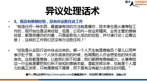 面谈表促成法及异议处理 靠双手致富,还是靠系统致富? 增员的来源 1.亲戚朋友中适合的人 2.单位内退的人 3.正在找工作的人 4.私营小业主 5.家庭妇女 作为一名刚入行不久的准主管,首先应该把注意力集中到以上的几个方面,可以达到事半功倍的效果 客观条件: 1、年龄:25周岁---55周岁 2、学历:高中以上(含) 3、外在条件:品貌端正、身体健康 4、婚姻状况:已婚较好 5、生活经历:在当地居住或两年以上,有一定的人脉 6、素质要求:积极努力,有较强的企图心,渴望改变现状,期望有较高收入;有一定 的沟通和表达能力 成功业务代表特征 增员的方法 努力也需要方法 1.缘故增员法:就是运用自己熟悉的人及身边的人际关系。*共同爱好:琴棋书画、音乐、球类、运动类等爱好者*生活交往:日常消费活动认识的人*社团成员: 参加交友会、联谊会、球迷会、商会、妇联等社团活动认识的人*其他行业的推销员:各类促销人员、各行销售人员、商场营业员等 2.介绍增员法:利用他人的影响力,转介绍身边的人。*公司内勤人员*原先的客户*朋友与老同事 *各行各业有联络的人 3.直接增员法:陌生拜访 4.媒介增员法:通过报纸、网络、电视、小区招聘 增员面谈的技巧 ☆ 要想做好一件事情,事前做好准备是必不可少的 1.心态的准备:人的情绪是可以互相感染的,面谈时让对方充分地感受到你充满信心,而且魅力四射,结果往往会事半功倍。别忘了,你的态度决定你的成就! 2.带上工具:公司简介、话术资料、签字笔、求职表、面试邀请函 3.熟悉话术,实战演练:“艺高人胆大”,只要将面谈的步骤、话术、工具、异议处理做到烂熟于胸,才能在面谈做到游刃有余,有效的控制面谈,使之按照自己的节奏进行,顺利达到首次面谈的目的 面谈的步骤
