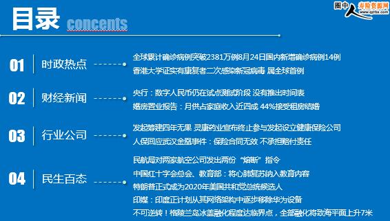 每日新闻速递 2020年8月26日 星期三 目录 时政热点 财经新闻 行业公司 民生百态 全球累计确诊病例突破2381万例8月24日国内新增确诊病例14例 香港大学证实有康复者二次感染新冠病毒 属全球首例 央行:数字人民币仍在试点测试阶段 没有推出时间表 婚房置业报告:月供占家庭收入近四成 44%接受租房结婚 发起筹建四年无果 灵康药业宣布终止参与发起设立健康保险公司 人保回应武汉金凰事件:保险合同无效 不承担赔付责任 民航局对两家航空公司发出两份“熔断”指令 中国红十字会总会、教育部:将心肺复苏纳入教育内容 特朗普正式成为2020年美国共和党总统候选人 印媒:印度正计划从其网络架构中逐步移除华为设备 不可逆转!格陵兰岛冰盖融化程度达临界点,全部融化将致海平面上升7米 时政热点 全球累计确诊病例突破2381万例8月24日国内新增确诊病例14例 2020-08-2 09:01 来源:36氪 Worldometers世界实时统计数据显示,截至北京时间8月25日12时48分,全球新冠肺炎累计确诊病例突破2381万例,达到23,812,221例,累计死亡病例超过81.7万例,达到817,016例。 据国家卫健委,8月24日0—24时,31个省(自治区、直辖市)和新疆生产建设兵团报告新增确诊病例14例,均为境外输入病例(四川4例,广东3例,上海2例,陕西2例,天津1例,河北1例,辽宁1例);无新增死亡病例;无新增疑似病例。 香港大学证实有康复者二次感染新冠病毒 属全球首例 2020-08-24 10:17 来源:中国新闻网 8月24日电 一名新冠肺炎康复者自欧洲返回香港后,其新冠病毒检测结果再次呈阳性。香港大学微生物学系团队证实,该患者是第二次感染新冠病毒,属全球首例。 综合无线新闻、香港01等香港媒体24日报道,被证实二次感染新冠病毒的患者为一名33岁男子,他于今年3月底确诊感染新冠病毒,4月中旬康复出院,8月初经英国到西班牙旅行,返回香港后接受检测再度确诊。香港大学微生物学系团队证实,该患者两次感染的病毒株基因排序明显不同。 ...........