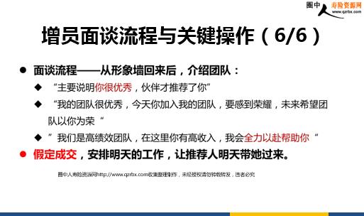 保险增员面谈流程与关键操作 关键词: 沟通保险理念 介绍公司情况 展示形象墙 安排明日工作 增员面谈流程与关键操作(1/6) 了解增员人基本情况家庭情况:判断居所情况,人脉资源;以前工作经历:判断沟通方式,对销售工作适应性;过往收入:拿什么收入水平才能打动他,同时用自己的高收入来影响他,锁定沟通策略。 增员面谈流程与关键操作(2/6) 沟通保险理念,使增员对象建立对保险的基本认知国家大力支持,民众保险观念越来越好;你买过保险么?——没买过,说明您周边的保险市场空白,机会很大;买过,说明您保险意识很好,应该让更多的人拥有跟你一样的保障。 增员面谈流程与关键操作(3/6) 公司情况介绍:实力雄厚,待遇优厚民生保险很有实力,大股东万向集团,产业很大;绩优团队,人力规模不大,但收入高,待遇好。新人永远相信他听到的,你要有信心告诉她新人津贴,一年时间,最高1.2万 增员面谈流程与关键操作(4/6) 优秀团队吸引,为接下来形象墙展示做铺垫团队收入水平高介绍团队成员都很优秀 增员面谈流程与关键操作(5/6) 走公司展示墙,5-10分钟文化原地:工作时间自由,展示团队业余生活,公司出钱旅游;钻星墙