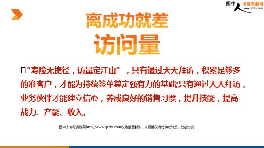 保险销售之加强访量胜过富二代 你是富二代??家里有金山银山?老婆孩子不用钱? 开销算一算 生活费?电话费?交通费?教育费?人情费?还有……钱 从何来? 明路:加强访量升官发财 想一想 您想收入多少? 您的目标? 寿险的收入来源 收入=拜访量*(知识+技巧) 离成功就差 访问量 “寿险无捷径,访量定江山”,只有通过天天拜访,积累足够多的准客户,才能为持续签单奠定强有力的基础;只有通过天天拜访,业务伙伴才能建立信心,养成良好的销售习惯,提升技能,提高战力、产能、收入。 调整心态 相信至上
