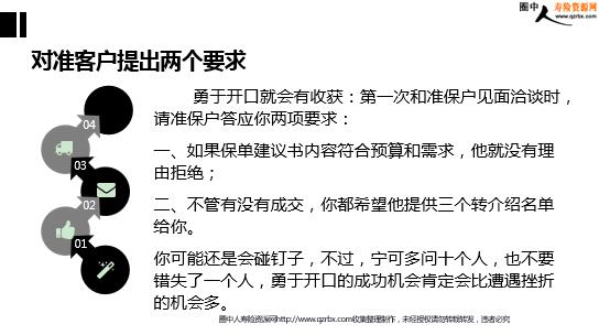 保险销售技巧,不容错过 只要你真正理解保险,客户就认可保险! 真理 只要你肯去推销大单,客户自会购买大单! 签单必备 YOUR TITLE 拜访量定江山 一个关于拜访量与促成率的调查: 勇于接受拒绝、勇于向“不”挑战的业务人员才能获得最后的胜利!! 行销流程评估表 你知道自己在销售技巧上有哪些不足吗? A、用积极的字眼,例如: “拥有保障”, 而不是 “买保险”。 B、对公司新保单、价格、销售策略等,皆了如指掌。 C、对产品特征及利益掌握得当。 D、能够辨清促成的时机 E、对每一次说明都能事后检讨,对错误的策略加以改进。 F、不要说“我不知道”就算了,要说:“我可以替您找到答案”。 让客户留下良好的第一印象 准客户对业务人员的第一印象,往往决定在初次见面的九十秒内 良好的第一印象7%来自于舌灿莲花,35%来自说话的腔调与沉稳度,而仪容、身体语言及态度高达58% 有时第一印象甚至在拜访客户前就已经决定了!! 四、电话后续追踪技巧 让好的服务成为开发第二张保单的钥匙 你的目的是希望很快的促成,然后失去客户?还是和客户发展出长期有契约关系,让客户向你买第二张保单? 身为保险业务人员,即使只是送保这样一件简单的事,都是增加客户好感,传达你对客户关怀的机会。定期检视客户的保单,更是我们的义务。 对准客户提出两个要求 勇于开口就会有收获:第一次和准保户见面洽谈时,请准保户答应你两项要求:一、如果保单建议书内容符合预算和需求,他就没有理由拒绝;二、不管有没有成交,你都希望他提供三个转介绍名单给你。你可能还是会碰钉子,不过,宁可多问十个人,也不要错失了一个人,勇于开口的成功机会肯定会比遭遇挫折的机会多。