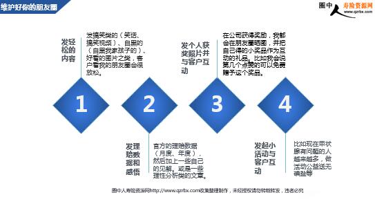 微信营销小技巧 目 录 维护好你的朋友圈 维护好你的朋友圈 添加好友时一定要加备注 添加好友时一定要加备注 新获得一个微信好友,要做的第一件事就是“加备注”。比如,张三推荐了李四,那我在李四的微信昵称后面要备注上她的真实姓名和推荐人:风信子 李四-张三。因为“风信子”是李四的昵称,昵称是可以随时更换的,如果不备注真实姓名,一旦对方换了昵称就很难找到了。 另外,备注好推荐人,可以在需要帮助或是互动时马上找到推荐人。比如,李四购买了保险,我会马上感谢一下张三;李四获得了理赔,我也会马上告知张三。这样很方便互动。 如何称呼你的新好友 如何称呼你的新好友 对新加的微信好友第一个称呼都是“某某老师,您好!”这样的尊称对男女老少都适合。不会称呼对方先生或者是女士,这样感觉太生份。如果后来很熟络了,称呼她姐姐、妹妹。 如何“破冰”
