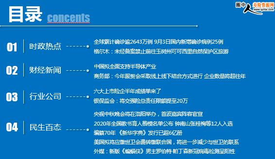 每日新闻速递 2020年9月5日 星期六 目录 时政热点 财经新闻 行业公司 民生百态 全球累计确诊逾2643万例 9月3日国内新增确诊病例25例 格尔木:未经备案禁止前往玉树州可可西里自然保护区旅游 中国拟全面支持半导体产业 商务部:今年服贸会采取线上线下结合方式进行 企业数量将超往年 六大上市险企半年成绩单来了 银保监会:将交强险总责任限额提至20万 央视中秋晚会将在洛阳举办,首波嘉宾阵容官宣 2020年全国教书育人楷模名单公布 钟南山张桂梅等12人入选 编纂70年 《新华字典》发行已超6亿册 美国拟将应缴世卫会费转缴联合国,将进一步减少与世卫的联系 外媒:新版《蝙蝠侠》男主罗伯特·帕丁森新冠病毒检测呈阳性 时政热点 全球累计确诊逾2643万例 9月3日国内新增确诊病例25例 2020-09-4 07:57 来源:36氪 据国家卫健委,9月3日0—24时,31个省(自治区、直辖市)和新疆生产建设兵团报告新增确诊病例25例,均为境外输入病例(广东13例,上海5例,广西2例,陕西2例,天津1例,福建1例,四川1例);无新增死亡病例;无新增疑似病例。 海外网9月4日电Worldometer网站实时统计数据显示,截至北京时间9月4日6时30分左右,全球累计确诊新冠肺炎病例26437669例,累计死亡病例872119例,90个国家确诊病例超过万例。 格尔木:未经备案禁止前往玉树州可可西里自然保护区旅游 2020-09-4 10:17 来源:新京报 据青海格尔木市公安局微信公众号消息,9月4日,格尔木公安局发布通告,禁止一切社会团体和个人随意从格尔木前往玉树州可可西里自然保护区开展旅游、探险、非法穿越等活动。警方提示,自即日起,凡是出租车、私家车由格尔木载客前往可可西里自然保护区的一律必须先行前往公安机关进行备案。 格尔木警方表示,擅自在可可西里自然保护区开展旅游、探险、非法穿越等活动,不仅严重破坏脆弱的高原生态环境,而且存在极大安全隐患,随时会面临缺氧、迷途、沼泽陷车等生命威胁。