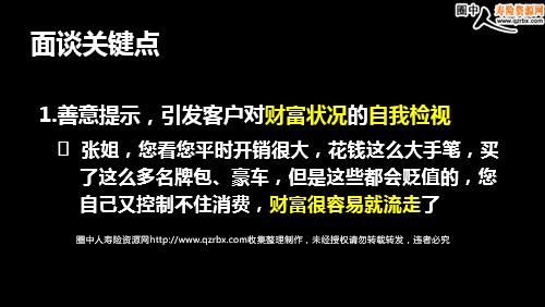 社区单客户加保 三个需求点 社区单客户加保三个需求点 一、强制储蓄 二、资产保全 三、财富传承 客户特征总结: 面谈关键点 面谈关键点 是你的钱” 面谈关键点 3.孩子成长过程中需要充足的教育金储备 面谈关键点 4.保险是进行强制储蓄最好的工具 费导致财富流失 成功案例 社区单客户加保三个需求点 一、强制储蓄 二、资产保全 三、财富传承 客户特征总结: 面谈关键点 1.强调资产保全的必要性 养老的钱 ”——xx 面谈关键点 2.借助CRS,强调税务规划的重要性 面谈关键点 交换,今后在海外隐藏资产将变得更加困难 面谈关键点 人、过去没有如实向移民国报税的人 外汇管制的人、设立海外公司的人 面谈关键点 分资产信息进行隐藏,其他金融资产难以做到 成功案例 100万标保大单。 社区单客户加保三个需求点 一、强制储蓄 二、资产保全 三、财富传承 客户特征总结: 面谈关键点 1.交流创业史,引发客户对家业的保护欲 分享一下吗 面谈关键点 企业传承的问题了 哪一个孩子呢 面谈关键点 3.由企业传承过度到财富传承 面谈关键点 4.强调保险在财富传承中的重要作用 他们的生活质量,这种方式稳定且风险很低 面谈关键点 5. 引导客户所有子女做全面规划 成功案例 交200万。