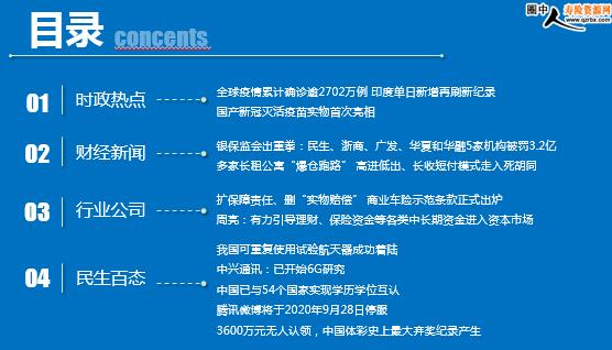 每日新闻速递 2020年9月7日 星期一 目录 时政热点 财经新闻 行业公司 民生百态 全球疫情累计确诊逾2702万例 印度单日新增再刷新纪录 国产新冠灭活疫苗实物首次亮相 银保监会出重拳:民生、浙商、广发、华夏和华融5家机构被罚3.2亿 多家长租公寓“爆仓跑路” 高进低出、长收短付模式走入死胡同 扩保障责任、删“实物赔偿” 商业车险示范条款正式出炉 周亮:有力引导理财、保险资金等各类中长期资金进入资本市场 我国可重复使用试验航天器成功着陆 中兴通讯:已开始6G研究 中国已与54个国家实现学历学位互认 腾讯微博将于2020年9月28日停服 3600万元无人认领,中国体彩史上最大弃奖纪录产生 时政热点 全球疫情累计确诊逾2702万例 印度单日新增再刷新纪录 2020-09-6 07:57 来源:环球网 Worldometer网站实时统计数据显示,截至北京时间9月6日6时30分左右,全球累计确诊新冠肺炎病例27020044例,累计死亡病例882738例,91个国家确诊病例超过万例。印度卫生部门5日上午公布数据显示,过去24小时,全国新增86432例新冠肺炎病例,累计确诊达4023179例。这是印度单日新增病例数最多的一天。印度也再次打破单一国家单日新增确诊病例数的纪录。由此,印度成为世界上第三个累计新冠肺炎病例数超过400万的国家,仅次于美国和巴西。 9月5日0—24时,31个省(自治区、直辖市)和新疆生产建设兵团报告新增确诊病例10例,均为境外输入病例(广东3例,陕西3例,上海2例,福建1例,甘肃1例);无新增死亡病例;新增疑似病例2例,均为境外输入病例(均在上海)。 国产新冠灭活疫苗实物首次亮相 2020-09-6 10:17 来源:中国经济网 在9月5日-9日于北京举办的2020年中国国际服务贸易交易会上,受邀在公共卫生防疫专题展区参展的国药集团中国生物,拿出承研的两款新冠灭活疫苗以主咖身份首次惊艳亮相,引来全场关注。 据了解,参展的两款新冠灭活疫苗目前均已进入最后的Ⅲ期临床试验阶段,正在阿联酋、巴林、秘鲁、摩洛哥、阿根廷等国家和地区紧锣密鼓地展开。入组接种5万人、样本人群现已覆盖115个国家,各方面进展均全球领先。与此同时,中国生物于北京和武汉两个生物制品研究所分别建设高等级生物安全生产设施,两个疫苗生产车间年产能合计可达3亿剂。