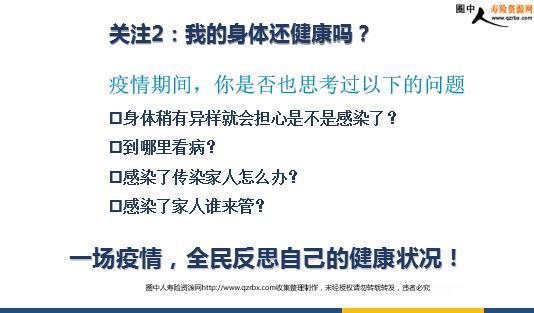 后疫情时代保险热点话题 后疫情 时代正式到来! 4 月 8 日 新冠疫情对生活的影响,简单来说,就是一个词:“健康” 包括财务健康、身体健康…… 疫情过后全民的两大关注点 每天输液两瓶白蛋白,每瓶425元 丙球蛋白每天八瓶,每瓶600元 人工心肺机开机就是5万元,再用一天2万元 其他的药物和人力费用,一个人总共需要71万元因关注度、影响性及特殊性,由国家买单! 一场疫情,全民反思自已的财务状况 关注1:治疗新冠重症患者的治疗费用? 疫情期间,你是否也思考过以下的问题身体稍有异样就会担心是不是感染了?到哪里看病?感染了传染家人怎么办?感染了家人谁来管? 一场疫情,全民反思自己的健康状况! 关注2:我的身体还健康吗? 只因:疫情集中爆发 疫情高峰时,单日不过3000人的新增确诊,已让我们恐慌、焦虑、举国救治 而有一类疾病,日均新增在10000以上,多少人一边称它为“绝症”一边却无视 那么,重点来了! 思考一: 从小到大,你的身边有没有人因为疾病而离开了我们? 数据来源:疫情数据-百度实时疫情;恶性肿瘤-2015年数据,2019国家癌症中心 一年393万人确诊癌症每分钟有7.5个人罹患癌症每天约有10000人确诊每个人一生癌症发生率三成以上!请注意:这仅是2015-2019年的数据! 不仅是“谈癌色变”更要提前预防 如果你认为,疾病离你很远,那你就错了! 据国家癌症中心2018发布数据显示: 人一生中患重大疾病的概率高达72.18%