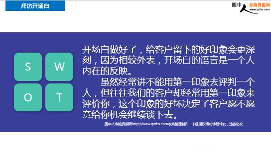 拜访开场白技巧 拜访客户是保险销售人员的日常工作之一,而拜访客户时的开场白,直接决定着销售员客户拜访的成败。 会客开场白技巧 保险销售人员的必备技能,必学课。 实例 销售员A如约来到客户办公室。开场白如下:“陈总,您好!看您这么忙还抽出宝贵的时间来接待我,真是非常感谢啊!(感谢客户。) “陈总,办公室装修得这么简洁却很有品位,可以想象到您应该是个做事很干练的人!”(赞美客户。) 实例 陈总面带微笑非常详细地和该销售员谈起来。 从上面这个例子来看,会客开场白有哪些要点呢? 拜访开场白 好开场白的目的 一、吸引对方的注意力 二、引起客户的兴趣 拜访开场白 好的开场白能使客户乐于与我们继续交谈下去。 拜访开场白 好的开场白的关键 找出客户最关注的话题是开场的关键 案例的主人公A销售员,就通过很好的开场白吸引了客户,有了个漂亮的开门红,就等于向促成销售迈进了一步。 开场白是销售人员与客户见面时,前两分钟要说的话,而如果是电话行销,则是前30秒要说的话。 拜访开场白 哪些因素影响着客户对业务员的印象! 拜访开场白 第一印象取决于衣着与销售人员的言行举止 第二印象就是这短短的开场白 拜访开场白 开场白做好了,给客户留下的好印象会更深刻,因为相较外表,开场白的语言是一个人内在的反映。虽然经常讲不能用第一印象去评判一个人,但往往我们的客户却经常用第一印象来评价你,这个印象的好坏决定了客户愿不愿意给你机会继续谈下去。