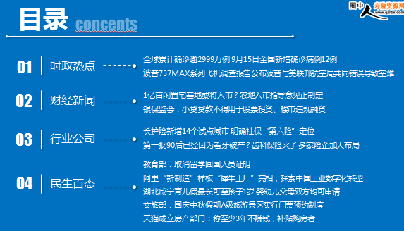 每日新闻速递 2020年9月18日 星期五 目录 时政热点 财经新闻 行业公司 民生百态 全球累计确诊逾2999万例 9月15日全国新增确诊病例12例,均为境外输入病例 波音737MAX系列飞机调查报告公布:波音与美联邦航空局共同错误导致空难 1亿亩闲置宅基地或将入市?农地入市指导意见正制定 银保监会:小贷贷款不得用于股票投资、楼市违规融资 长护险新增14个试点城市 明确社保“第六险”定位 第一批90后已经因为看牙破产?齿科保险火了 多家险企加大布局 教育部:取消留学回国人员证明 阿里“新制造”样板“犀牛工厂”亮相,探索中国工业数字化转型 湖北咸宁育儿假最长可至孩子1岁 婴幼儿父母双方均可申请 文旅部:国庆中秋假期A级旅游景区实行门票预约制度 天猫成立房产部门:称至少3年不赚钱,补贴购房者 时政热点 全球累计确诊逾2999万例 9月15日全国新增确诊病例12例,均为境外输入病例 2020-09-17 10:00:39 来源:兰州日报 Worldometer网站实时统计数据显示,截至北京时间9月17日6时30分左右,全球累计确诊新冠肺炎病例29996340例,累计死亡病例944145例,94个国家确诊病例超过万例。 9月15日0—24时,31个省(自治区、直辖市)和新疆生产建设兵团报告新增确诊病例12例,均为境外输入病例(四川4例,上海2例,福建2例,浙江1例,广东1例,云南1例,陕西1例);无新增死亡病例;无新增疑似病例。 波音737MAX系列飞机调查报告公布:波音与美联邦航空局共同错误导致空难 2020-09-17 07:45:44 来源:新华网 美国国会众议院16日发布了有关波音737MAX系列飞机的调查报告,认定此前737MAX系列飞机的两起致命空难是由于波音公司及美国联邦航空局“犯下了一系列严重错误”共同导致的。报告还指出,美国联邦航空局的监管体系“存在严重问题”,亟须进行彻底改革。 美国国会的一个调查小组在历经18个月的调查后发布了这份报告。报告称,2018年10月新加坡狮航客机失事和2019年3月埃塞俄比亚航空公司航班失事这两起事故,“并不是由单一的机械故障、技术失误或者管理不当引起的”,而是“波音公司的工程师错误的技术假设、波音公司管理缺乏透明度以及美国联邦航空局监管严重不足共同引起的”。