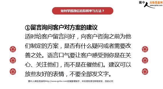 保险互联网营销技巧 俗话说,礼多人不怪。现在的网络交流礼仪,第一步便是礼貌问候。先主动说出自己的名字及身份,咨询对方需要哪些帮助。可先确认客户所在地,若是同城客户可以继续交流;反之,可以介绍给与客户同城的同行伙伴。 微信客户咨询 在交流过程中,切勿紧迫不舍给对方压迫感,循序渐进,不要流露出急躁的态度;仔细倾听,禁忌“话多且好辩”。交流方法参考如下 ①交流中多用敬语“您好、请问、谢谢”等。②真诚表明自己的身份,“您好,我是来自xx的xx,希望此次交流可以帮助到您!” ③友好的咨询对方的所在地址时,“请问,您现在是在哪个城市?”制作保障方案前,先仔细咨询客户情况 交谈过程中,应重点了解客户的实际情况(有无保险、年收入多少、职业性质、有无社保、家庭成员、负债及贷款情况等),以确认对方的保险需求。只有充分了解客户的具体情况,才能尽可能地帮助客户以最少的投入得到最适合的保障方案,更容易获得客户的赞同。 交流过程参考如下 根据客户的回答,重点分析客户的需求 沟通过程中,一定要看清客户咨询的问题,清楚问题是什么、怎样帮助他们解决问题,并及时记录客户所有的信息。没有得到客户的信任前,不要着急面谈,先聊需求、探讨保障方案,逐步建立信任。 深入探讨,制定并完善保障计划 在了解客户情况及保险需求的基础上,进一步沟通探讨,先为客户制定保障计划(保费不要超出对方原本的预算支出)。跟踪期间,可提供沃保网上的个人网站、个人荣誉、公司简介等信息,加深客户对自己的了解。 掌握时机,巧妙获取客户联系方式 询问客户,对方想用怎样的方式进行联络(微信、电话等)。 互留一下联系方式,方便以后进一步的沟通。对方犹豫时,可以先说出自己的联系方式,然后可以约个时间,再等客户的回复。