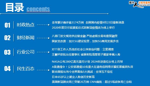 每日新闻速递 2020年9月24日 星期四 目录 时政热点 财经新闻 行业公司 民生百态 全球累计确诊逾3174万例 全国国内疫情9月23日最新消息 2020年诺贝尔奖颁奖仪式因新冠疫情改为线上举行 八部门发文规范供应链金融 严控虚假交易和重复融资 国家发改委:加大5G建设投资,加快5G商用发展步伐 对个别工作人员违反社会公序良俗问题:立案调查 王慧轩获批出任董事长 诚泰财险高管班子搬家幸福人寿 NASA公布280亿美元登月计划 2024年送首位女性上月球 A级通缉令!公安部通缉10名重大在逃电信网络诈骗犯罪集团头目 联合国指出当今世界面临5大挑战:全球互不信任 日本65岁以上就业人数创历史新高 美国新冠肺炎死亡突破20万例 CNN痛批:超过5场战争死亡总和 时政热点 全球累计确诊逾3174万例 全国国内疫情9月23日最新消息 2020-09-23 10:07:44 来源:新浪 Worldometer网站实时统计数据显示,截至北京时间9月23日6时30分左右,全球累计确诊新冠肺炎病例31740015例,累计死亡病例973892例,96个国家确诊病例超过万例。 国家卫生健康委员会23日通报,9月22日0-24时,31个省(自治区、直辖市)和新疆生产建设兵团报告新增新冠肺炎确诊病例10例,均为境外输入病例(广东4例,四川3例,天津1例,山东1例,河南1例);无新增死亡病例;无新增疑似病例。 2020年诺贝尔奖颁奖仪式因新冠疫情改为线上举行 2020-09-23 07:45:44 来源:新华社 诺贝尔基金会首席执行官拉尔斯•海肯斯滕22日表示,受新冠疫情影响,今年12月将不再举行传统的诺贝尔奖颁奖典礼,颁奖仪式将改为线上举行。 海肯斯滕当天在接受瑞典电视台采访时表示,由于新冠疫情在全球蔓延,诺贝尔基金会决定取消原定于12月10日在瑞典首都斯德哥尔摩举行的诺贝尔奖颁奖典礼。获奖者将不会按惯例被邀请至斯德哥尔摩,而是在各自国家获颁相关奖项。