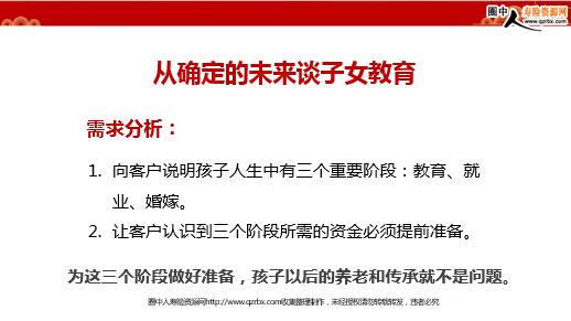 向客户说明孩子人生中有三个重要阶段:教育、就业、婚嫁。让客户认识到三个阶段所需的资金必须提前准备。 为这三个阶段做好准备,孩子以后的养老和传承就不是问题。 需求分析: 从确定的未来谈子女教育 业务员:艾姐,好久不见。看您朋友圈 ,这周末带孩子出去玩了呀!客户:对啊,工作日要上班,周末就要陪孩子啦。业务员:确实,养大一个孩子,父母除了要有时间上的陪伴,物质上的付出更是难以度量。作为父母,我们都希望为孩子提供最好的支持,给他确定的未来,而在孩子的成长过程中,有三个阶段尤为重要:①教育阶段:不管孩子读书好与坏,都要提前为他规划一笔教育资金,保证他能够接受良好的教育,让他更从容地面对自己的未来。 ②就业阶段:未来孩子如果能凭自己的努力实现自己的发展目标,是我们的骄傲。但如果父母能在孩子创业时提供支持,更能锦上添花。 ③婚嫁阶段:婚姻是一辈子的事,也是两个家庭的事。好的经济状况,可以为小两口的婚姻生活奠定基础。 一、话题导入: 操作要点:从教育、就业、婚嫁三个刚需阶段沟通,孩子成长除了陪伴,更需要物质基础 二、激发需求: 强调准备三笔资金必须满足两个条件 业务员:如果为孩子准备这三笔资金,必须满足两个条件: ①到期一定有:在孩子成长的每个阶段,都要确保一定会有一笔钱等着他使用,要用的时候就一定会有。 ②专款专用:这笔钱不会被父母的个人需求被挪用或打断,只为孩子的未来使用。 您觉得,在未来读个比较不错的大学,一年的学费和生活费要花多少钱呢? 操作要点:强调教育、就业、婚嫁资金的必须性、专款专用性,必须要用不被挪用,用强制储蓄功能的方式来准备