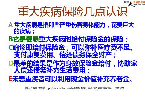 重疾险销售逻辑 幸福的一天 结实?还是结石! 早上喝一杯含丰富三聚氰胺的牛奶 再吃个有营养又有三聚氰胺的鸡蛋 再吃几个光鲜亮丽的染色馒头 我们大都过着安逸幸福的生活,享受着现代文明的成果,却不知已身处“风险胶囊”之中…… 用数据说话 根据《中国统计年鉴》显示,我国死于癌症的危险率为1/4,死于中风的危险率为1/14,我国有9000万高血压患者,肝炎患者占世界75%,我国每65人当中就有1名癌症患者,每24小时就会有3835人死于癌症,每6.64秒就会有1人死于心脑血管等慢性疾病,每年有20万妇女患乳腺癌…… 引发重疾的诱因: 一、人类赖以生存的空气、水、食物受到严重的污染,疾病的高发到了一个井喷点,呈现年轻化、多样化、普遍化 二、不良生活习惯:抽烟、酗酒、熬夜等 三、社会竞争压力大 四、遗传因素 五、新病症等…… xx高发重疾: 肺癌 胃癌 肝癌 甲状腺 乳癌 宫颈癌 据卫生部统计:人的一生罹患重大疾病的几率高达72.18% 超过1/3的人会得癌症 10个健康男性中3个会在65岁前得重疾 10个健康女性中2个会在65岁前得重疾重大疾病发病率逐年上升,不断上涨的医疗费用将会给家庭带来沉重的经济负担。 日本公布5大癌症诊断5年后存活率 重大疾病并不可怕 在遇到重大疾病之后,是否能够保持轻松淡定的心态治病,不担心未来5年之后,依然保持原来的生活品质不下降? 最美抗癌女孩—鲁若晴 89年,12年诊断血癌,虽然配型成功,但由于担心高昂医疗费拖累整个家庭,最终放弃治疗,于13年9月19日下午16:00时去世。
