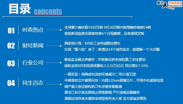 每日新闻速递 2020年9月28日 星期一 目录 时政热点 财经新闻 行业公司 民生百态 全球累计确诊超3302万例 9月26日国内新增确诊病例14例,均为境外输入病例 首批新冠疫苗志愿者结束6个月观察期,没有感冒发烧 国家统计局:8月份工业利润稳定增长 社保“第六险”来了,新增这14个城市试点,能缓解一个大问题 银保监会副主席曹宇:积极推动养老保险第三支柱建设 保险业前8月实现原保费收入3.32万亿元 同比增长7.15% 一箭双星!我国成功发射环境减灾二号01组卫星 中国首枚芯片邮票问世!内置120um超薄芯片,可用手机读取信息 国产最大直径盾构机刀头涂装京剧脸谱 黑龙江哈尔滨全面禁止销售散煤 严打违规运输储存 美国这地自来水遭致命微型变形虫入侵 官方紧急发警告 时政热点 全球累计确诊超3302万例 9月26日国内新增确诊病例14例,均为境外输入病例 2020-09-27 11:26:21 来源:36氪 Worldometer网站实时统计数据显示,截至北京时间9月27日6时30分左右,全球累计确诊新冠肺炎病例33021198例,累计死亡病例997691例,98个国家确诊病例超过万例。 9月26日0—24时,31个省(自治区、直辖市)和新疆生产建设兵团报告新增确诊病例14例,均为境外输入病例(辽宁4例,福建4例,四川3例,广东2例,上海1例);无新增死亡病例;无新增疑似病例。 首批新冠疫苗志愿者结束6个月观察期,没有感冒发烧 2020-09-27 07:45:44 来源:北京晚报 昨天,首批新冠疫苗志愿者之一——009号朱傲冰结束了6个月观察期,发微博记录了自己最后一次抽血检查的全过程。 朱傲冰是名退伍军人,同时也是湖北工程大学学生,今年3月19日 他接种了陈薇院士团队研发的新冠疫苗,“6个多月以来,我的身体都非常健康,没有感冒,也没有发烧。”朱傲冰昨天表示。