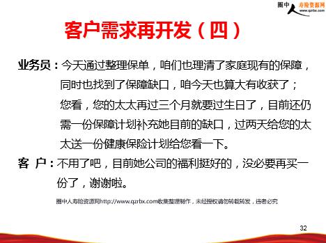 销售面谈之保单年检 课程阐述 课程目的: 1、明确保单年检的重要性 2、掌握保单年检的方法授课方式:讲授+演练 时 间:4课时/200分钟 收 获:通过保单年检有效获取转介绍名单及再次开发 课程大纲 一、保单年检的重要性二、保单年检的内容三、保单年检的方法 保单年检——依据客户现有的保单,全面梳理客户的保障方案,解决客户的疑问,并结合公司的新险种,做再次开发并有效获取转介绍名单。 一、保单年检的重要性 全险客户服务 无压力好邀约 客户不再怨你 保单年检重要性—对伙伴 保单年检重要性—对客户 让爱没有缺口 明确自己保障权益 充分了解保险服务 享受完善的服务 保单年检案例 xxxx xx — 从入司以来,连续10年月均件数不低于10件; — 单月件数最高为88件 — 服务客户 超过4000位 — 单一客户购xx保单41件保单年检— 是有效获取转介绍的前提之一 课程大纲 一、保单年检的重要性二、保单年检的内容三、保单年检的方法 二、保单年检的内容 保单年检的内容(一) 1、家庭地址 是否发生变更,邮编变更 2、联系方式 本人的手机号码是否更改 3、身份证号码 身份证是否更换二代身份证 4、 险种、保障 是否明确自己的产品及享有的利益 5、缴费时间、期间 是否知道缴费的时间与期间 6、缴费金额、保额 是否还记得保费及保额是多少 保单年检的内容(二) 用心的服务 带给客户最全面的保障