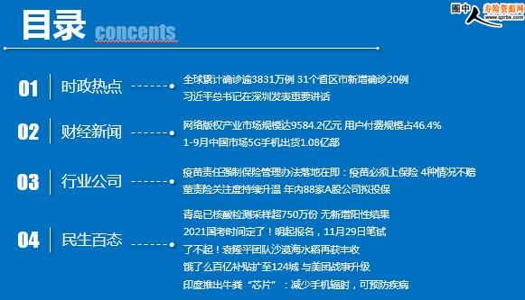 每日新闻速递 2020年10月15日 星期四 目录 时政热点 财经新闻 行业公司 民生百态 全球累计确诊逾3831万例 31个省区市新增确诊20例 习近平总书记在深圳发表重要讲话 网络版权产业市场规模达9584.2亿元 用户付费规模占46.4% 1-9月中国市场5G手机出货1.08亿部 疫苗责任强制保险管理办法落地在即:疫苗必须上保险 4种情况不赔 董责险关注度持续升温 年内88家A股公司拟投保 青岛已核酸检测采样超750万份 无新增阳性结果 2021国考时间定了!明起报名,11月29日笔试 了不起!袁隆平团队沙漠海水稻再获丰收 饿了么百亿补贴扩至124城 与美团战事升级 印度推出牛粪“芯片”:减少手机辐射,可预防疾病 时政热点 全球累计确诊逾3831万例 31个省区市新增确诊20例 2020-10-14 10:56:05 来源:北京日报 Worldometer网站实时统计数据显示,截至北京时间10月14日6时30分左右,全球累计确诊新冠肺炎病例38315898例,累计死亡病例1089514例,106个国家确诊病例超过万例。 10月13日0—24时,31个省(自治区、直辖市)和新疆生产建设兵团报告新增确诊病例20例,其中境外输入病例14例(广东6例,上海5例,陕西3例),本土病例6例(均在山东);无新增死亡病例;新增疑似病例2例,均为境外输入病例(均在上海)。 习近平总书记在深圳发表重要讲话 2020年10月14日 09:07 来源:信息时报 习近平总书记在深圳经济特区建立40周年庆祝大会上发表重要讲话,回顾了40年来深圳经济特区实现的五大历史性跨越,总结了经济特区40年改革开放、创新发展积累的十条宝贵经验,对新时代深圳经济特区建设提出六项明确要求,对经济特区党的建设和精神文明建设作出部署。