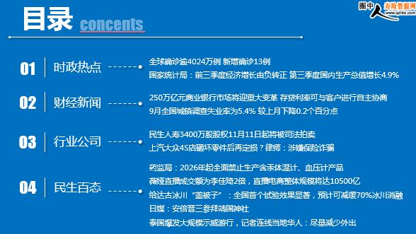 每日新闻速递 2020年10月20日 星期二 目录 时政热点 财经新闻 行业公司 民生百态 全球确诊逾4024万例 新增确诊13例 国家统计局:前三季度经济增长由负转正 第三季度国内生产总值增长4.9% 250万亿元商业银行市场将迎重大变革 存贷利率可与客户进行自主协商 9月全国城镇调查失业率为5.4% 较上月下降0.2个百分点 民生人寿3400万股股权11月11日起将被司法拍卖 上汽大众4S店砸坏零件后再定损?律师:涉嫌保险诈骗 药监局:2026年起全面禁止生产含汞体温计、血压计产品 薇娅直播成交额为李佳琦2倍,直播电商整体规模将达10500亿 给达古冰川“盖被子”:全国首个试验效果显著,预计可减缓70%冰川消融 日媒:安倍晋三参拜靖国神社 泰国爆发大规模示威游行,记者连线当地华人:尽量减少外出 时政热点 全球确诊逾4024万例 新增确诊13例 2020-10-19 09:27 来源:澎湃新闻 Worldometer网站实时统计数据显示,截至北京时间10月19日6时30分左右,全球累计确诊新冠肺炎病例40243940例,累计死亡病例1117893例,109个国家确诊病例超过万例。 10月18日0—24时,31个省(自治区、直辖市)和新疆生产建设兵团报告新增确诊病例13例,均为境外输入病例(上海5例,广东3例,天津2例,陕西2例,山西1例);无新增死亡病例;无新增疑似病例。 国家统计局:前三季度经济增长由负转正 第三季度国内生产总值增长4.9% 2020年10月19日 09:07 来源:中国基金报 今天上午10点,国新办举行新闻发布会,国家统计局发布前三季度国民经济运行情况。 初步核算,前三季度国内生产总值722786亿元,按可比价格计算,同比增长0.7%。分季度看,一季度同比下降6.8%,二季度增长3.2%,三季度增长4.9%。