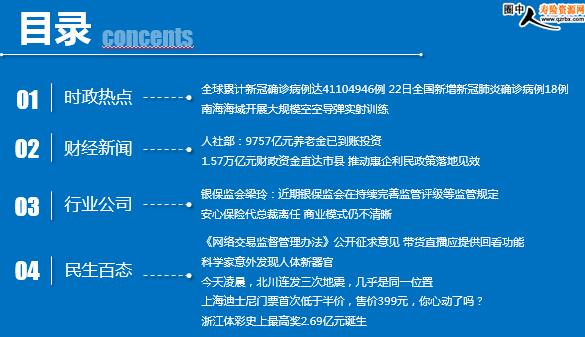 每日新闻速递 2020年10月24日 星期六 目录 时政热点 财经新闻 行业公司 民生百态 全球累计新冠确诊病例达41104946例 22日全国新增新冠肺炎确诊病例18例 南海海域开展大规模空空导弹实射训练 人社部:9757亿元养老金已到账投资 1.57万亿元财政资金直达市县 推动惠企利民政策落地见效 银保监会梁玲:近期银保监会在持续完善监管评级等监管规定 安心保险代总裁离任 商业模式仍不清晰 《网络交易监督管理办法》公开征求意见 带货直播应提供回看功能 科学家意外发现人体新器官 今天凌晨,北川连发三次地震,几乎是同一位置 上海迪士尼门票首次低于半价,售价399元,你心动了吗? 浙江体彩史上最高奖2.69亿元诞生 时政热点 全球累计新冠确诊病例达41104946例 22日全国新增新冠肺炎确诊病例18例 2020-10-23 10:19:30 来源:国际在线 世界卫生组织10月22日公布的最新数据显示,全球累计新冠确诊病例达41104946例。 10月22日0—24时,31个省(自治区、直辖市)和新疆生产建设兵团报告新增确诊病例18例,均为境外输入病例(上海9例,福建7例,重庆2例);无新增死亡病例;新增疑似病例2例,均为境外输入病例(均在上海)。 南海海域开展大规模空空导弹实射训练 2020年10月23日 09:07 来源:环球网 10月20日至21日,南部战区海军航空兵紧贴实战,在海南岛西部某海域,组织大规模空空导弹实射训练,近百名飞行员参训。发射导弹数十枚,有效检验了部队指挥协调,后装保障和实际使用武器能力。
