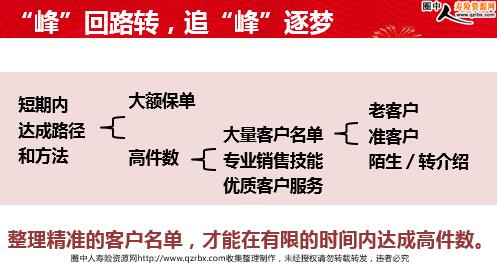 巧用客户名单整理助力产说会 “峰”回路转 追“峰”逐梦 冲刺目标 功成“名”就 目 录 我的感悟 改变一:收入大幅提升 双峰会给予我4个改变 改变二:肩负使命,心态更加坚定 130位客户 306份保障保额超过2亿 “峰”回路转,追“峰”逐梦 改变三:技能更加娴熟 “峰”回路转,追“峰”逐梦 改变四:荣誉更加丰硕 “峰”回路转,追“峰”逐梦 短期内达成路径和方法 大额保单 高件数 大量客户名单专业销售技能优质客户服务 老客户准客户陌生/转介绍 整理精准的客户名单,才能在有限的时间内达成高件数。 “峰”回路转,追“峰”逐梦 “峰”回路转 追“峰”逐梦 冲刺目标 功成“名”就 目 录 我的感悟 收集客户信息整理客户档案精准筛选客户名单明确需求,高效行动 冲刺目标,功成“名”就 保单号险种缴费年期保费保额生效日期投被保人生日 收集客户信息 方便搜检完整信息了解购买偏好、保障漏洞发现缴费空档期与收入是否匹配、金账户VIP差距直观了解加保空间保证继续率、续期与客户见面机会两次生日前促成的机会