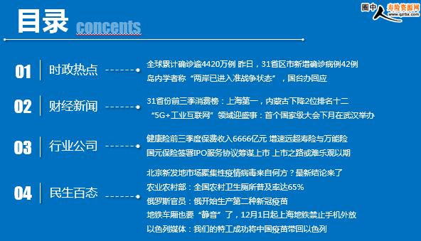 每日新闻速递 2020年10月29日 星期四 目录 时政热点 财经新闻 行业公司 民生百态 全球累计确诊逾4420万例 昨日,31省区市新增确诊病例42例 岛内学者称“两岸已进入准战争状态”,国台办回应 31省份前三季消费榜:上海第一,内蒙古下降2位排名十二 “5G+工业互联网”领域迎盛事:首个国家级大会下月在武汉举办,将助力湖北疫后重振 健康险前三季度保费收入6666亿元 增速远超寿险与万能险 国元保险签署IPO服务协议筹谋上市 上市之路或难乐观以期 北京新发地市场聚集性疫情病毒来自何方?最新结论来了 农业农村部:全国农村卫生厕所普及率达65%以上 生活垃圾收运处置体系覆盖90%以上行政村 俄罗斯官员:俄开始生产第二种新冠疫苗 地铁车厢也要“静音”了,12月1日起上海地铁禁止手机外放 以色列媒体:我们的特工成功将中国疫苗带回以色列 时政热点 全球累计确诊逾4420万例 昨日,31省区市新增确诊病例42例 2020-10-28 10:41 来源:环球网 Worldometer网站实时统计数据显示,截至北京时间10月28日6时30分左右,全球累计确诊新冠肺炎病例44208650例,累计死亡病例1170941例,110个国家确诊病例超过万例。 10月27日0—24时,31个省(自治区、直辖市)和新疆生产建设兵团报告新增确诊病例42例,其中境外输入病例20例(上海7例,陕西6例,广东2例,天津1例,河北1例,内蒙古1例,河南1例,四川1例),本土病例22例(均在新疆);无新增死亡病例;无新增疑似病例。 岛内学者称“两岸已进入准战争状态”,国台办回应 2020年10月28日 09:07 来源:北京日报 国台办今天上午举行例行新闻发布会,发言人朱凤莲回答记者提问。有记者问,日前岛内有学者列出“八个证据”,称“两岸已进入准战争状态”,请问发言人对此有何评论。 朱凤莲说,我们注意到了相关报道。民进党当局与“台独”分裂势力勾连外部势力,加紧谋“独”挑衅,是造成当前台海形势复杂严峻的根源。我只重申一点,我们维护国家主权和领土完整的意志坚如磐石,绝不为任何形式的“台独”分裂活动留下任何空间。