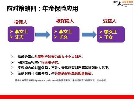 法律法规营销年金保险 前言 近年来,银行保险的中、高端客户开始趋向于理性消费,他们更看重所购买的金融产品的安全性、合法性以及其刚性承诺,更加关注从长期来看,该产品是否可以帮助其规避公司或家庭未来可能发生风险。 借助法律法规营销年金保险的时机已经成熟 高净值人群面临的高发风险 一、高净值人群面临的婚姻风险防范及应对策略 李女士在亲朋好友中是(全职)富太太,丈夫常年在外经营企业,获利时,丈夫不断给李女士大额的款项,但最近两年发现丈夫有些变化,给自己的钱少了很多,有时还向李女士索取钱款。2014年李女士发现丈夫有转移财产的行为。李女士感到意外的是…… 案例一:全职太太面临的婚姻风险 应对策略一:婚内夫妻财产约定 可以防止共同财产被转移,但容易造成夫妻关系彻底决裂。 应对策略二:不离婚,婚内分割财产 《解释三》: 一方有转移、隐匿、变卖夫妻共同财产或者伪造夫妻共同债务的;另一方可以向法院提出诉讼,将隐匿或变更的财产申请保护。在分割财产时,隐匿或变更夫妻共同财产的一方少分或者不能分割这部分的财产。 应对策略三:年金保险应用 李女士父母(李女士出钱) 李女士 李女士子女 投保人 受益人 被保险人 将部分婚内共同财产转变为李女士个人财产。李女士父母交钱,李女士领生存金。保单是李女士婚后个人专属资产,不被分割。受益人为李女士子女,李女士身故后身故保险金为子女个人专属资产,保障子女的生活。