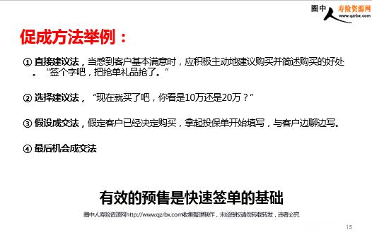 ——促成技巧大提升 “色”眼看促成 这两本书看过吗? 有人利用它成了名有人利用它结了婚有人利用它增了员还可以用它来促成 色眼识人的重要性 首先明确一个概念: 保险是什么? 从销售学来说,所有的商品无非两种: 使用周期短,易重复购买的商品:个人护理用品食品饮料保健品烟酒药品中的非处方药 使用周期长,一般可以多次使用的商品:家电家具汽车房子电脑手机 快速消费品 耐用消费品 银行作为金融超市,产品也可以分两种: 周期短,易重复购买的商品:股票基金短期理财周期长,不太会重复购买:黄金存款保险 快速消费品 耐用消费品 但保险作为一种耐用消费品的一种,销售起来总没有那么顺畅,更多的时候非常“磨人”,究其原因,主要有以下几点:金额较高:怕买贵了——“10万太多了,要交10年了,怕后面交不起” 产品复杂:怕买错了——“这个产品我要研究研究” 产品雷同:怕买多了——“保险我家里买的很多了” 非急需品:怕冲动了——“不急,我回头跟家里商量商量” 耐用消费品的难点 苏宁电器统计过,在所有门店耐用消费品的首次成交率不会高于10%,但销售高手能够达到20%以上,关键在于会识别客户的真实想法,并运用技巧做好拒绝处理。