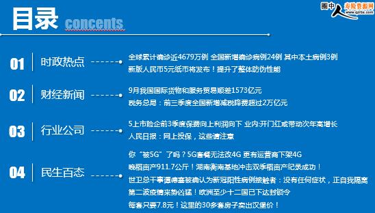 每日新闻速递 2020年11月3日 星期二 目录 时政热点 财经新闻 行业公司 民生百态 全球累计确诊近4679万例 全国新增确诊病例24例 其中本土病例3例 新版人民币5元纸币将发布!提升了整体防伪性能 9月我国国际货物和服务贸易顺差1573亿元 税务总局:前三季度全国新增减税降费超过2万亿元 5上市险企前3季度保费向上利润向下 业内:开门红或带动次年高增长 人民日报:网上投保,这些请注意 你“被5G”了吗?5G套餐无法改4G 更有运营商下架4G 晚稻亩产911.7公斤!湖南衡南基地冲击双季稻亩产纪录成功! 世卫总干事谭德塞被确认为新冠阳性病例接触者:没有任何症状,正自我隔离 第二波疫情来势凶猛!欧洲至少十二国已下达封锁令 每套只要7.8元!这里的30多套房子卖出汉堡价! 时政热点 全球累计确诊近4679万例 全国新增确诊病例24例 其中本土病例3例 2020-11-02 08:40:53 来源:金融界网站 Worldometer网站实时统计数据显示,截至北京时间11月2日6时30分左右,全球累计确诊新冠肺炎病例46789004例,累计死亡病例1204813例,112个国家确诊病例超过万例。 11月1日0—24时,31个省(自治区、直辖市)和新疆生产建设兵团报告新增确诊病例24例,其中境外输入病例21例(上海6例,广东5例,山西3例,甘肃3例,四川2例,天津1例,江苏1例),本土病例3例(均在新疆);无新增死亡病例;新增疑似病例1例,为境外输入病例(在上海)。 新版人民币5元纸币将发布!提升了整体防伪性能 2020年11月2日 09:07 来源:界面新闻 据“中国人民银行”微信公众号11月2日消息,中国人民银行定于2020年11月5日起发行2020年版第五套人民币5元纸币。2020年版第五套人民币5元纸币保持2005年版第五套人民币5元纸币规格、主图案、主色调、“中国人民银行”行名、国徽、盲文面额标记、汉语拼音行名、民族文字等要素不变,优化了票面结构层次与效果,提升了整体防伪性能。