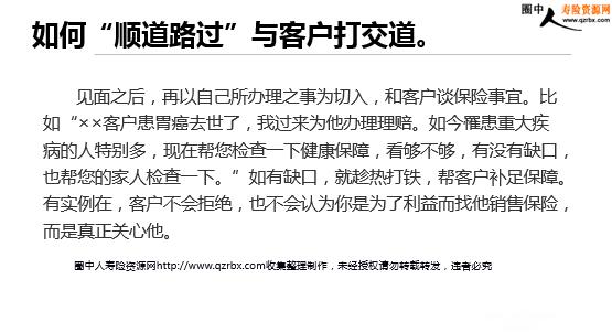 找好理由约客户 客户的时间也是宝贵的,要想客户在你身上花时间,那你得找好客户无法拒绝的理由,让客户愿意接纳。 不少营销员都陷入了一个恶性循环——找不到拜访客户的理由→被客户拒绝→不敢拜访客户。 其中的关键因素是没有一个好的拜访客户的理由,见不到客户,即使见到客户也无法让拜访深入进行。 想一想 客户接起你的电话,第一个念头想的是什么? 你约客户,客户怎么想? 客户想的往往是:跟我有什么关系?你能够给我提供什么价值?鉴于此,你接下来需要有一个价值的陈述,简单明了的告诉客户你可以哪些价值。 对客户有价值的才是好理由! 远见 坚持 决策 创新 平时我会在事先通知客户的情况下,去见客户,在客户闲暇之余进行销售。这些在与客户见面之前也需要准备好自己的理由,这些理由让客户放下防备。 机缘巧合法 机缘巧合法适用于有一定熟识程度的对象,主要是缘故市场和已成交保单的客户,主要目的是不给客户推销的感觉和购买的压力,而是如同“随风潜入夜、润物细无声”般进行销售。 在机缘巧合下见面,在顺其自然中谈保险,最终也顺理成章地成交保单。让一切都在自然而然中发生,客户完全感觉不到你在特意推销保险,这是高明的营销员运用机缘巧合法的境界。 如何“顺道路过”与客户打交道。 营销员先去到客户工作的地方或居住的小区,然后打电话告诉客户:“好久没见,今天我在您家附近办理一个理赔(或者其他什么事情),顺便来看看您。” 见面之后,再以自己所办理之事为切入,和客户谈保险事宜。比如“××客户患胃癌去世了,我过来为他办理理赔。如今罹患重大疾病的人特别多,现在帮您检查一下健康保障,看够不够,有没有缺口,也帮您的家人检查一下。”如有缺口,就趁热打铁,帮客户补足保障。有实例在,客户不会拒绝,也不会认为你是为了利益而找他销售保险,而是真正关心他。