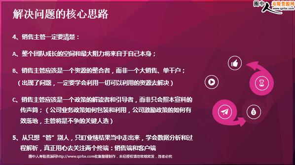 团队业绩提升 前言 拿破仑说:“一头狮子带领的一群羊,可以打败一头羊带领的一群狮子。” 启发:从现在起,你就是团队的头!你是狮子还是羚羊将影响团队的命运! 在非洲的草原上,如果见到羚羊在奔逃,那一定是狮子来了;如果见到狮子在躲避,那一定是象群发怒了;如果见到成千上万的狮子和大象集体逃命的壮观景象,那是蚂蚁军团来了。 启发:团队成功大于个人成功! 主管问题 解决问题的核心思路 1、强化主管的的培训和辅导;要深信,没有一个主管想当坏主管;要是主管有问题,其根源一定是在更高级别的领导身上; 2、改变主管的根本管理思路:由“管”改为“帮”;(你能力再强,上有政策,下肯定会有对策;你能力再弱,没有一个人会拒绝别人的真心帮助;) 3、作为销售主管一定要区分两个概念: A、我们要去“帮”员工,而不是直接去替代员工把活干完; B、团队成功一定大于个人成功,一定要善于用团队的利量去拿结果;(将独善其身,自己做好业绩就好;改为-大家好才是真的好!)解决问题的核心思路 4、销售主管一定要清楚: A、整个团队成长的空间和最大阻力将来自于自己本身; B、销售主管应该是一个资源的整合者,而非一个大销售、单干户;(出现了问题,一定要学会利用一切可以利用的资源去解决) C、销售主管应该是一个政策的解读者和引导者,而非只会照本宣科的传声筒;(公司业务政策如何包装和利用,公司激励政策的如何有效落地,主管将是不争的关键人选) 5、从只想“管”别人,只盯业绩结果当中走出来,学会数据分析和过程解析,真正用心去关注两个终端:销售端和客户端解决问题的核心思路 6、销售团队管理的核心在于从“管人”中脱离出来,先做到“理人”,进而做到“安人”; A、“管人”是最低层次的做法,其结果往往是:上面的人老是想“管”,下面的人就是不“理”;特别想“管”别人的主管,往往得不到一个好结果; B、“理人”通俗地说,就是要看得起对方,要想从心理看到起自己的员工,则必须清楚地知道自己员工的优点在哪里,否则这个看得起一定是假的、不长久的,做作的!我们只有学会“理人”,我们才可能真正清楚自己团队的战斗力在哪里?解决问题的核心思路