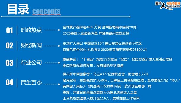 每日新闻速递 2020年11月6日 星期五 目录 时政热点 财经新闻 行业公司 民生百态 全球累计确诊逾4836万例 全国新增确诊病例28例 2020美国大选最新消息 拜登关键州票数反超 主动扩大进口 中国设立10个进口贸易促进创新示范区 直播电商全民化 机构预计2020年直播电商规模9610亿元 重磅解读!“十四五”规划15次提及“保险” 保险将逐步成为生活必需品 重疾险新规即将发布:没有剔除甲状腺癌 福布斯中国富豪榜:马云4377亿蝉联首富,财富增长72% 耐克宣布:总部裁员扩大40%,已解雇上百名副总经理,全球要花17亿“炒人” 英国富人乘私人飞机逃离二次封城 网友:欧洲现在哪都一样 美媒:拜登目前所获选票数为历届总统候选人之最 土耳其地震遇难人数升至116人,震后搜救工作结束 时政热点 全球累计确诊逾4836万例 全国新增确诊病例28例 2020-11-05 08:40:53 来源:金融界网站 Worldometer网站实时统计数据显示,截至北京时间11月5日6时30分左右,全球累计确诊新冠肺炎病例48369616例,累计死亡病例1229285例,112个国家确诊病例超过万例。 11月4日0—24时,31个省(自治区、直辖市)和新疆生产建设兵团报告新增确诊病例28例,其中境外输入病例20例(上海8例,四川4例,陕西3例,河南2例,北京1例,内蒙古1例,福建1例),本土病例8例(均在新疆);无新增死亡病例;新增疑似病例3例,均为境外输入病例(上海2例,内蒙古1例)。 2020美国大选最新消息 拜登关键州票数反超 2020-11-05 10:15:14 来源:金十数据 环球网引援美国福克斯新闻最新统计数据显示,民主党总统候选人拜登拿下密歇根州,获得该州16张选举人票,至此共获264张选举人票。目前,拜登已获得264张选举人票,特朗普则获得214张选举人票。
