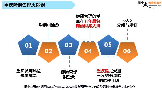 因为有你重疾不重 ——重疾产品销售逻辑及技能 请思考:重疾险销售能给客户带来什么?重疾险销售能给自己带来什么? 顶额销售健康险家庭保单开拓 健康险销售无上限重疾险销售新高度 做好重疾险销售,晋阶新高度 目录 重疾险销售理念逻辑 工具的运用:图、故事、话术 分逻辑演练通关 重疾险销售理念逻辑 重疾险销售理念逻辑 重疾险销售理念逻辑 我们人人都在追求健康长寿,可是究竟人活多久才算够?中国人平均寿命为73.5岁,癌症已成为国民健康的第一杀手,中国每分钟有6个人被确诊为恶性肿瘤,癌症发病率及死亡率呈逐年上升趋势。 一位北京的医生曾经说过,一个人这一生一定会得重大疾病,如果没有得,那是因为别的原因先离开了还没机会得。(八大金句)而中国人在得病之前,都特别自信,觉得自己一辈子肯定不会得癌症。而一旦得了癌症就更加自信了,觉得自己肯定会死!(八大金句)重疾发病风险越来越高 重疾险销售理念逻辑 重疾发病风险越来越高 三高 重大疾病的发病率越来越高治疗重疾的费用越来越高治愈率越来越高 一低 发病年龄越来越低 随着医学技术的发展与进步,得了恶性肿瘤并不意味着死亡,我们身边就有不少治愈成功的案例(王楠——2005年发现患甲状腺癌,经及时治疗后痊愈,2008年奥运会取得一金一银的辉煌战绩后功成身退)。其实,癌症是一种慢性病。一方面,癌症发病缓慢,它的形成需要几十年的时间,所以是可以提前预防的;另一方面,我们可以通过及时,有效,长期的治疗让癌症得到控制,甚至让患者长期存活。 重疾险销售理念逻辑 重疾可治愈