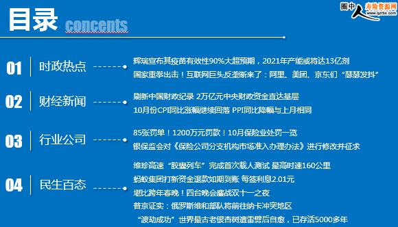 每日新闻速递 2020年11月11日 星期三 目录 时政热点 财经新闻 行业公司 民生百态 辉瑞宣布其疫苗有效性90%大超预期,2021年产能或将达13亿剂 国家重拳出击!互联网巨头反垄断来了:阿里、美团、京东们“瑟瑟发抖” 刷新中国财政纪录 2万亿元中央财政资金直达基层 10月份CPI同比涨幅继续回落 PPI同比降幅与上月相同 85张罚单!1200万元罚款!10月保险业处罚一览 银保监会对《保险公司分支机构市场准入办理办法》进行修改并征求意见 维珍高速“胶囊列车”完成首次载人测试 最高时速160公里 蚂蚁集团打新资金退款如期到账 每签利息2.01元 堪比跨年春晚!四台晚会鏖战双十一之夜 普京证实:俄罗斯维和部队将前往纳卡冲突地区 “渡劫成功”世界最古老银杏树遭雷劈后自愈,已存活5000多年 时政热点 辉瑞宣布其疫苗有效性90%大超预期,2021年产能或将达13亿剂 2020-11-10 07:51:33 来源:每日经济新闻 北京时间11月9日晚,当地时间周一盘前,辉瑞、BioNTech发布新冠疫苗Ⅲ期实验第一次中期分析显示疫苗安全有效,辉瑞和BioNtech表示,试验数据显示,他们的Covid-19疫苗有超过90%的有效性。 若该疫苗完全达到安全性和有效性的要求,辉瑞和BioNTech就计划向美FDA提交紧急使用授权(EUA),目前该计划预计将在11月的第三周进行。此外预计在2020年将生产5000万剂疫苗,到2021年将生产多达13亿剂疫苗。 国家重拳出击!互联网巨头反垄断来了:阿里、美团、京东们“瑟瑟发抖” 2020年11月10日 08:37:34 来源:中国基金报 11月10日,市场监管总局就《关于平台经济领域的反垄断指南(征求意见稿)》公开征求意见。其中指出,平台经济领域垄断协议主要是指平台经营者、平台内经营者排除、限制竞争的协议、决定或者其他协同行为。协议、决定可以是书面、口头等形式。