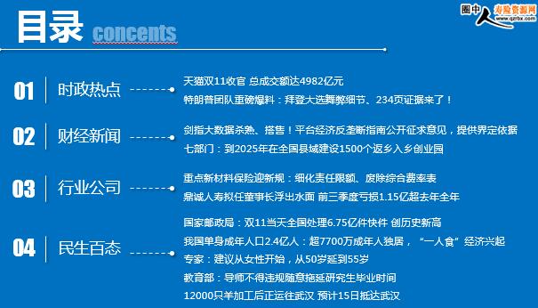 每日新闻速递 2020年11月13日 星期五 目录 时政热点 财经新闻 行业公司 民生百态 天猫双11收官 总成交额达4982亿元 特朗普团队重磅爆料:拜登大选舞弊细节、234页证据来了! 发改委唐登杰:十三五以来消费对我国经济增长贡献率超过60% 农业农村部部长:今年粮食丰收成定局 产量有望创新高 重点新材料保险迎新规:细化责任限额、废除综合费率表 鼎诚人寿拟任董事长浮出水面 前三季度亏损1.15亿超去年全年 国家邮政局:双11当天全国处理6.75亿件快件 创历史新高 我国单身成年人口2.4亿人:超7700万成年人独居,“一人食”经济兴起 专家:建议从女性开始,从50岁延到55岁 教育部:导师不得违规随意拖延研究生毕业时间 12000只羊加工后正运往武汉 预计15日抵达武汉 时政热点 天猫双11收官 总成交额达4982亿元 2020-11-12 07:51:33 来源:每日经济新闻 天猫双11收官,自11月1日0点至11月11日0点30分其实时成交额达到4982亿元。 正在上传...今年天猫双11全球狂欢季将由1天变成4天,从“光棍节”到“双节棍”,开启两波售卖阶段,第一阶段售卖提前到11月1日-3日,第二波售卖为11月11日当天。今年天猫双十一将汇集1400万款商品,较去年双11增加40%,5000+新品牌以及2000个产业带将首次参与双11,预计将有8亿消费者参与其中。 特朗普团队重磅爆料:拜登大选舞弊细节、234页证据来了! 2020年11月11日 08:37:34 来源:新加坡万事通 昨晚,美国现任总统特朗普发推预告称,“选票腐败将于今晚9时(新加坡时间11日上午10时)在福克斯的肖恩•汉尼蒂节目中被揭露”。 今天上午,汉尼蒂在他的节目中,抖出密歇根州、亚利桑那州等地的内幕,还找来特朗普的帮手,来帮他开腔。他和这两人探讨了一番“邮寄选票危害特朗普大选”,麦克纳尼更是展示了一份234页的“证据”,称特朗普团队将继续诉诸法律,确保“清点的每一张选票均为合法”。