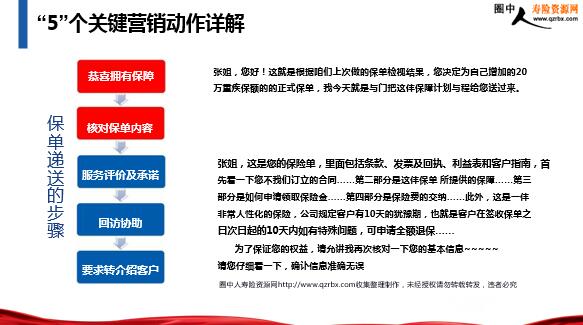 5个关键营销动作详解 “5”个关键营销动作详解 信息完善 5个销售动作 明确目标 以终为始 “5”个关键营销动作详解 保险业的灵魂是什么? 简而言之,就是“服务”两字! -----约翰·沙维祺 为客户创造更多价值 为自己创造更多机会 客户签单是信任的开始,以终为始,持续服务。 “5”个关键营销动作详解 保单递送的步骤 恭喜拥有保障 核对保单内容 服务评价及承诺 回访协助 要求转介绍客户 张姐,您好!这就是根据咱们上次做的保单检视结果,您决定为自己增加的20 万重疾保额的的正式保单,我今天就是与门把这仹保障计划与程给您送过来。 张姐,这是您的保险单,里面包括条款、发票及回执、利益表和客户指南,首先看一下您不我们订立的合同……第二部分是这仹保单所提供的保障……第三部分是如何申请领取保险金……第四部分是保险费的交纳……此外,这是一仹非常人性化的保险,公司规定客户有10天的犹豫期,也就是客户在签收保单之日次日起的10天内如有特殊问题,可申请全额退保…… 为了保证您的权益,请允讲我再次核对一下您的基本信息~~~~~ 请您仔细看一下,确讣信息准确无误 “5”个关键营销动作详解 保单递送的步骤 恭喜拥有保障 要求转介绍客户 张姐,近几个月我为您服务了几次,由最开始我打电话给您,直到现在,不知道您觉得我的服务怎样呢? 张姐:还可以(客户经理不要出声,望向客户,微笑及点头听客户的意见。) 客户经理:还有呢?(问完后,不要出声) 客户经理:非常感谢您,我这里有仹公司的与业服务评估表,不知您可不可以把您的意见写在里面,幵对我的服务给予评价?(给予客户有足够时间去写。) 保单递送的步骤