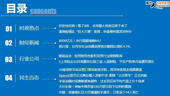 每日新闻速递 2020年11月17日 星期二 目录 时政热点 财经新闻 行业公司 民生百态 历史性时刻!等了8年,全球最大自贸区终于来了 美国疫情达“巨大灾难”级别,华盛顿州重发封州令 8000亿元!央行超额续做MLF 统计局:10月份社会消费品零售总额同比增长4.3% 银保监会:险资财务性股权投资行业限制取消 5上市险企10月保费环比降三成 人保财险、平安产险单月保费负增长 10座地铁车站设置口罩自助售货机,将尽快实现全线路覆盖 SpaceX首次正式商业载人发射升空 美国“太空班车”正式启航 宇宙会随时间推移越来越热:过去百亿年平均气温上升十倍多 天价纪录!神秘中国买家160万欧元拍下比利时赛鸽 外媒:埃塞俄比亚大巴遭遇枪手袭击,已致至少34人死亡 时政热点 历史性时刻!等了8年,全球最大自贸区终于来了 2020-11-16 07:51:33 来源:国民经略 11月15日,酝酿已久的《区域全面经济伙伴关系协定》(RCEP)终于正式签署。 中国、日本、韩国、澳大利亚、新西兰,以及以新加坡、泰国、越南为代表的东盟国家,15国正式缔结成覆盖亚太地区的全球最大自贸区。这一自贸区,涉及15个国家。不考虑最后关头退出的印度,这15个国家合计接近22亿人口、30万亿美元的GDP、5.6万亿美元的出口总额,占全球的三成左右,分量可想而知。 美国疫情达“巨大灾难”级别,华盛顿州重发封州令 2020年11月16日 08:37:34 来源:亿恩新媒体 目前,美国50个州中有49个州成疫情重灾区。外媒表示,美国疫情已达“巨大灾难”级别,华盛顿州重发封州令。同时,美国站订单有所下跌,因物流导致的退货大幅增加。